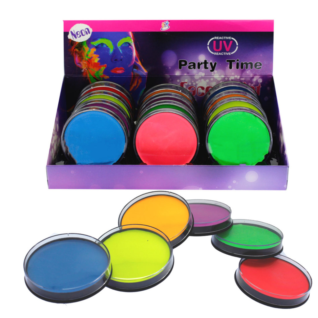 Intenzív neon arcfesték szett 6 élénk színnel, amely UV-fényben és sötétben is világít. Ideális bulikra, fesztiválokra, jelmezekhez és tematikus rendezvényekre.