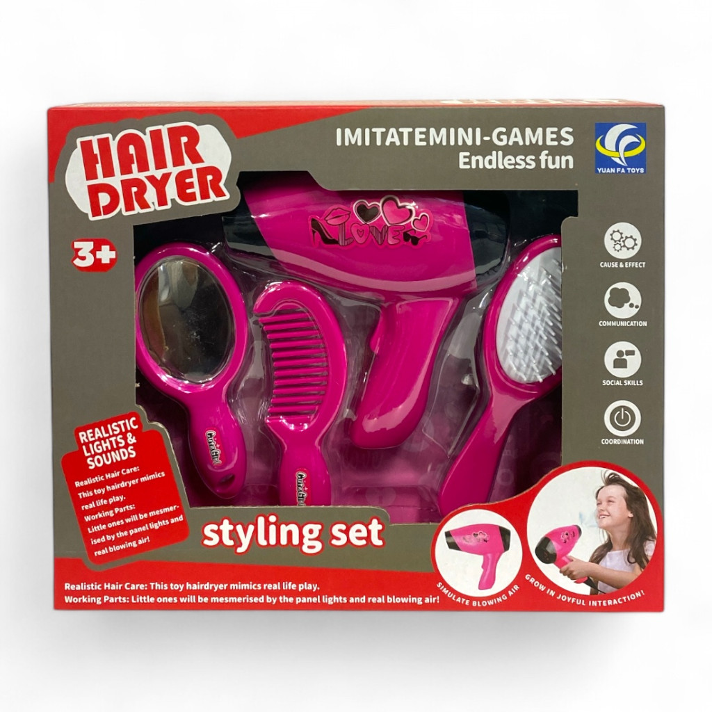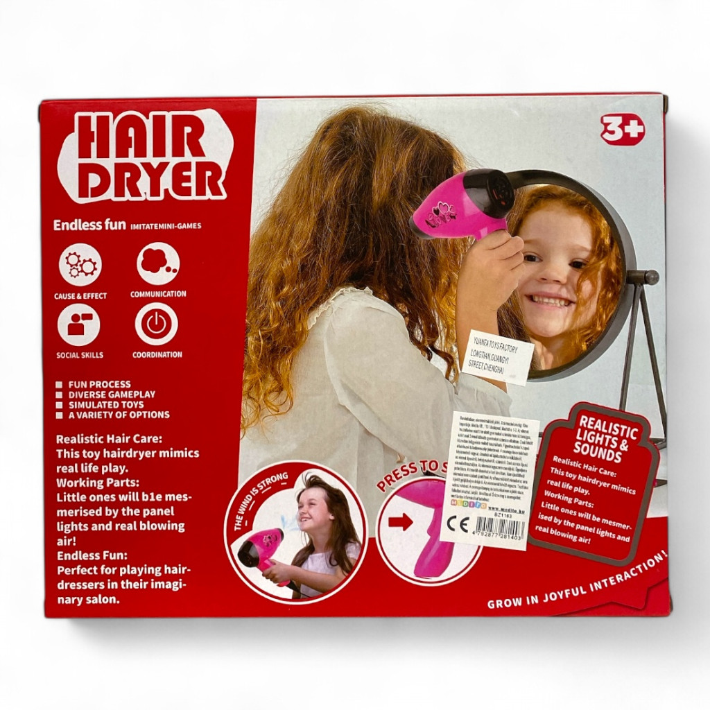 Varázsold otthonodat egy képzeletbeli szépségszalonná ezzel a színes és interaktív játék hajszárító szettel! A szett tartalmaz egy rózsaszín hajszárítót, amely valósághű fény- és hanghatásokat produkál, valamint egy tükröt, fésűt és kefét, hogy minden kislány kedvére alkothassa a legszebb frizurákat.