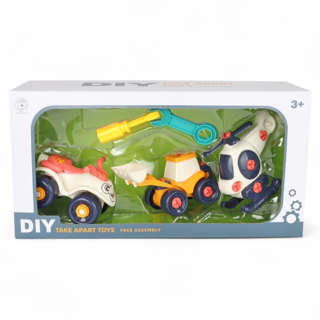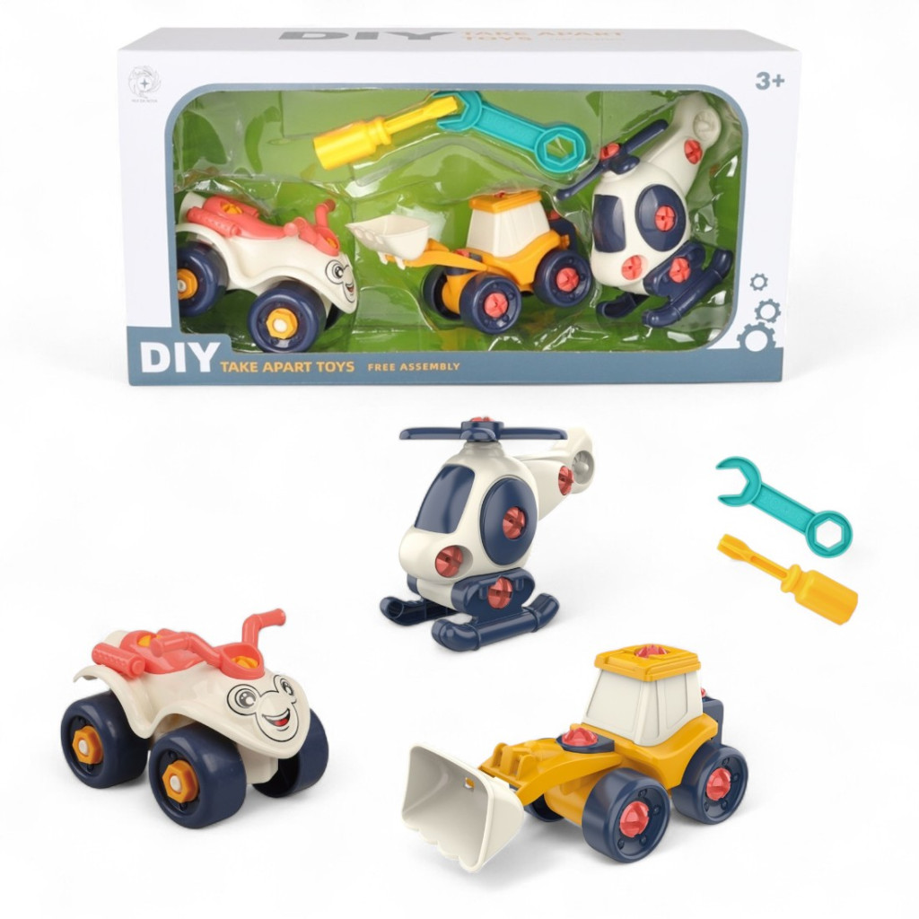 Fedezd fel a szerelős jármű készletet, amely három izgalmas modellt tartalmaz: munkagépet, helikoptert és quadot!