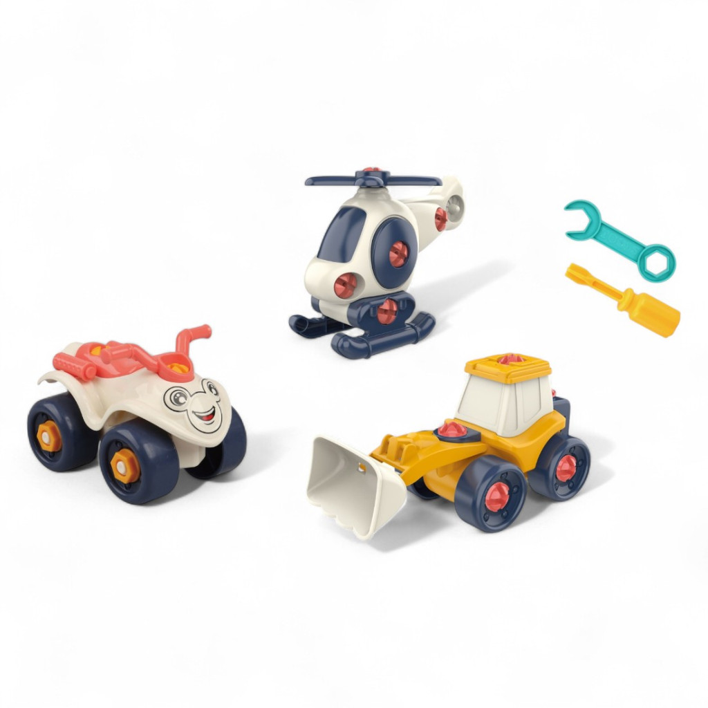 Ez a szerelős jármű készlet tökéletes választás a járművek és a szerelés iránt érdeklődő gyerekek számára. A készlet három különböző modellt tartalmaz: egy masszív munkagépet, egy dinamikus helikoptert és egy gyors quadot. Minden modell könnyen összeszerelhető és szétszedhető, így fejleszti a kézügyességet és a problémamegoldó képességet.