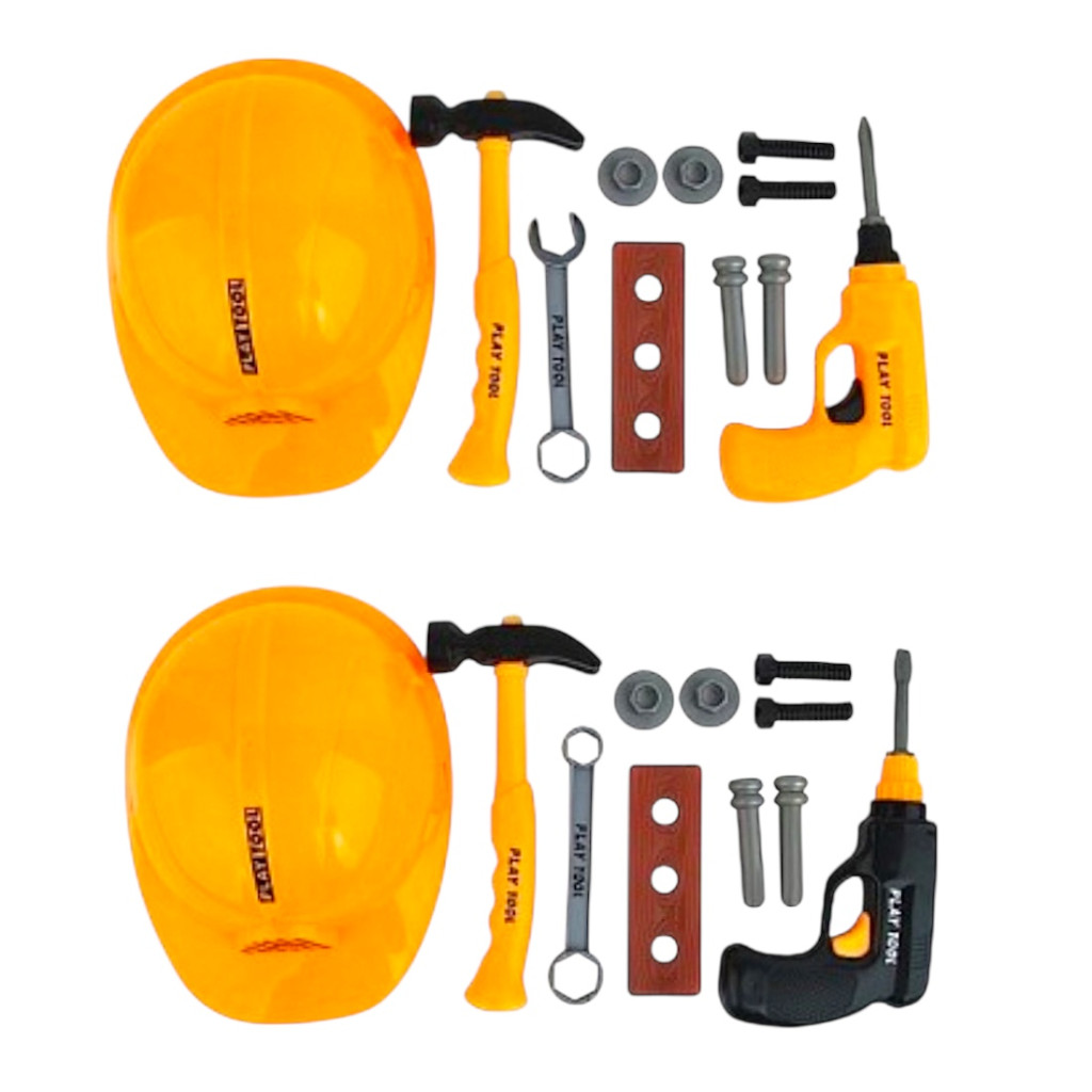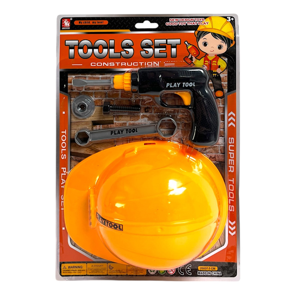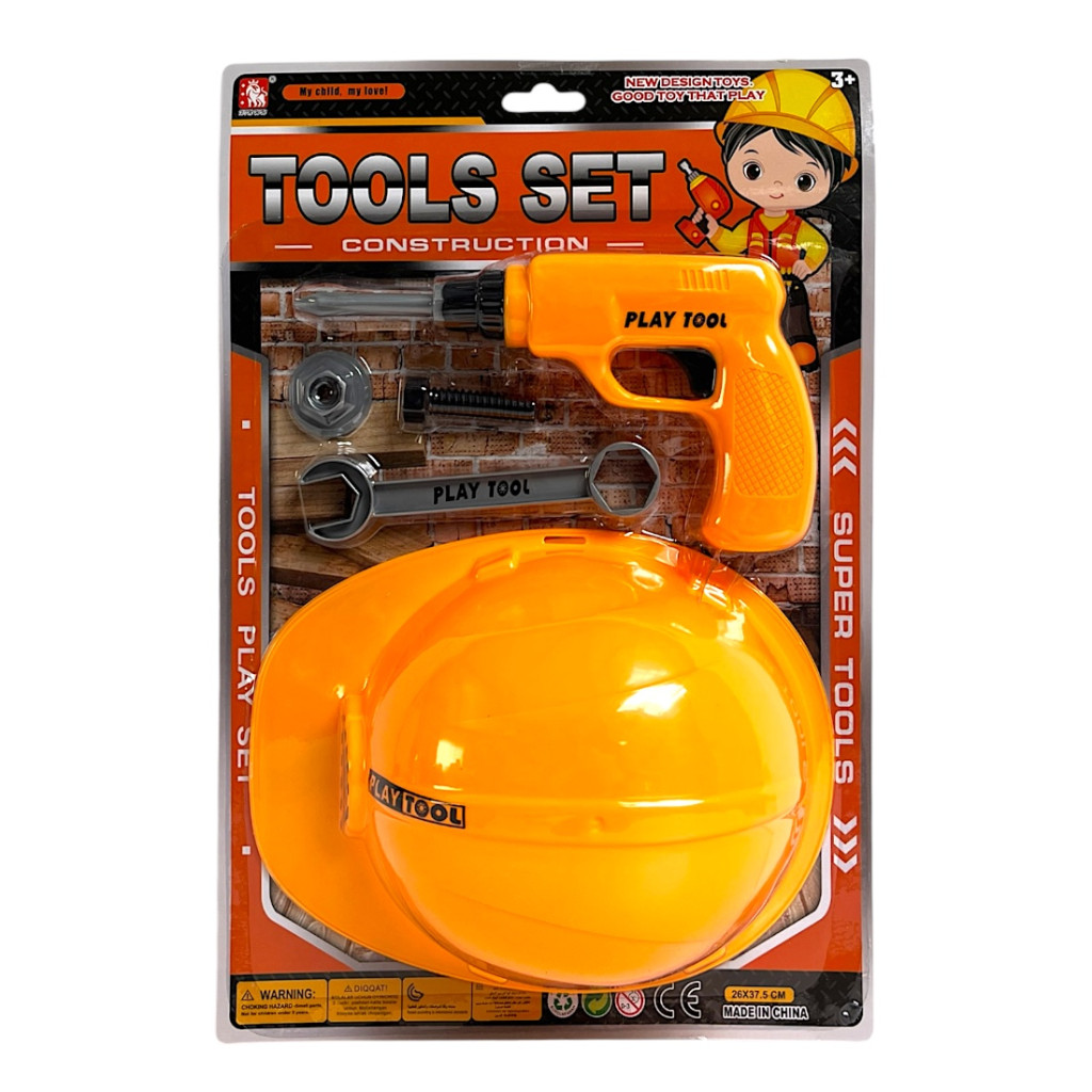 Játék szerszámgép készlet fúrógéppel és munkás sisakkal, kétféle színben. A 26x38 cm-es lapon érkező szett szerepjátékhoz, barkácsolós játékokhoz ideális gyerekeknek.