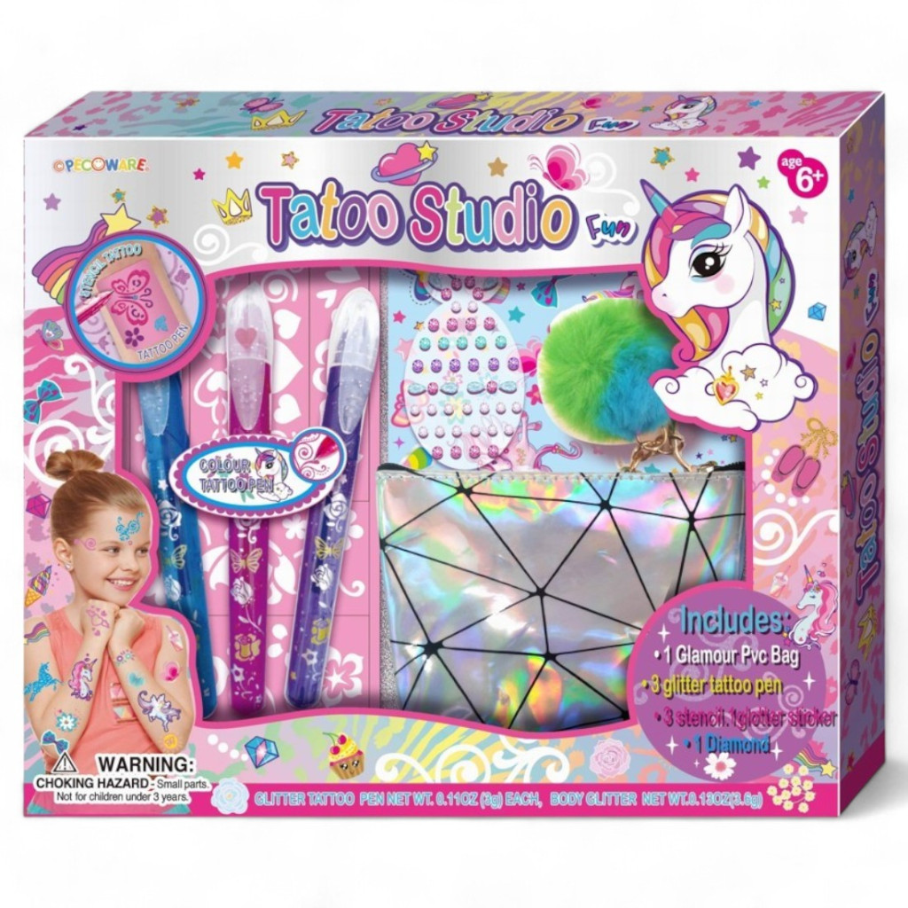 Tattoo Studio Fun – Csillámtetkó készlet PVC neszesszerrelAlkoss ragyogó tetkókat – stílusosan, saját stúdiódban!Ez a különleges tetoválás készlet nem csak a fantáziát, de a stílusérzéket is megmozgatja! A szettben mindent megtalálsz, hogy egy igazi kreatív „mini szépségszalon” élményt nyújts: csillámos tollak, sablonok, testmatricák és strasszkövek – mindez egy trendi, hologramos neszesszerben, pomponos cipzárral!A készlet tartalma: