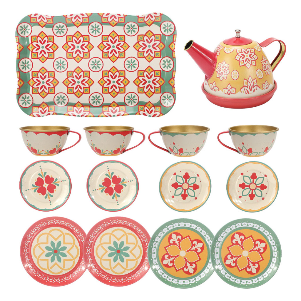 Mit tartalmaz a készlet?Ez a lenyűgöző szett egy teáskannát, négy csészét, négy csészealjat és egy színpompás tálcát tartalmaz. Minden darab könnyű, strapabíró anyagból készült, így a játék évekig tartó élményt garantál. A különböző elemek a teázás klasszikus élményét idézik, amelynek köszönhetően gyermeke valódi kis házigazdává válhat.