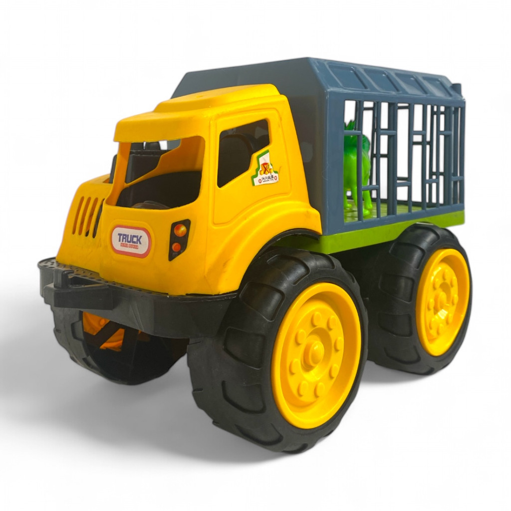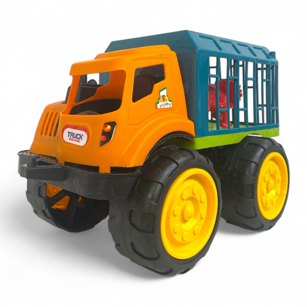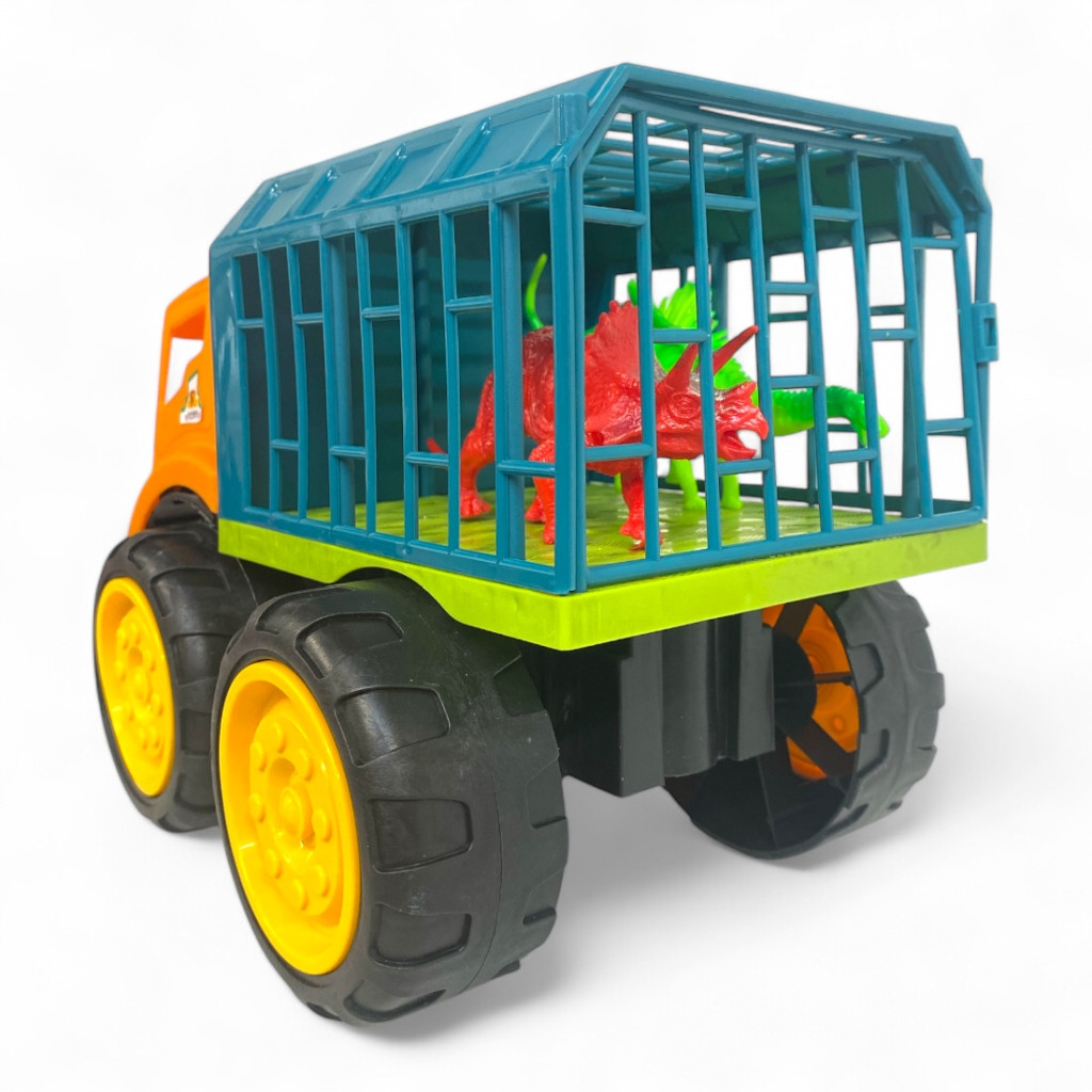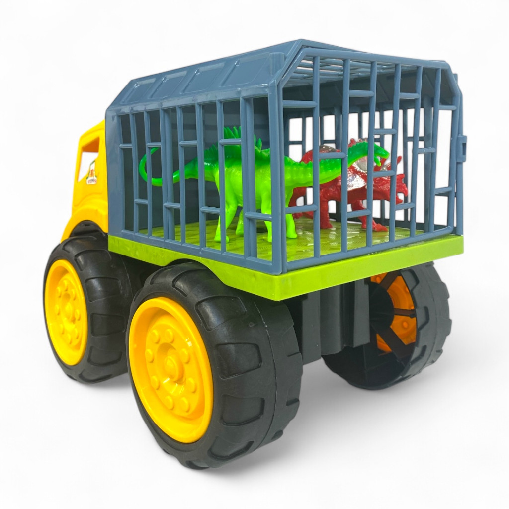 Izgalmas dínószállító teherautó két dinoszaurusszal, ketreces felépítménnyel és szabadonfutó kerekekkel.