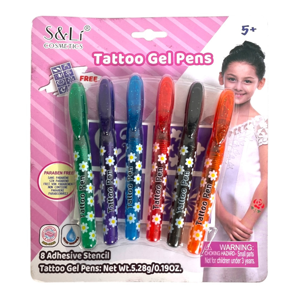 5 darabos testmatrica szett 18x22 cm-es lapon, tetováló tollal kiegészítve. Ideális kreatív sminkhez, alkalmi testdíszítéshez, bulikra és jelmezekhez.
