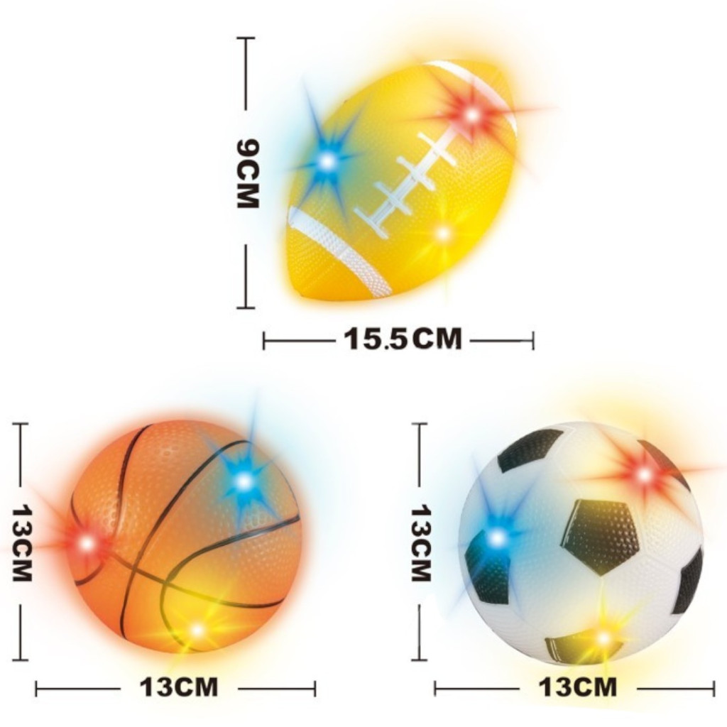 Három különböző labda egy csomagban: világító focilabda, kosárlabda és amerikai foci labda – mindenki megtalálja a kedvencét!