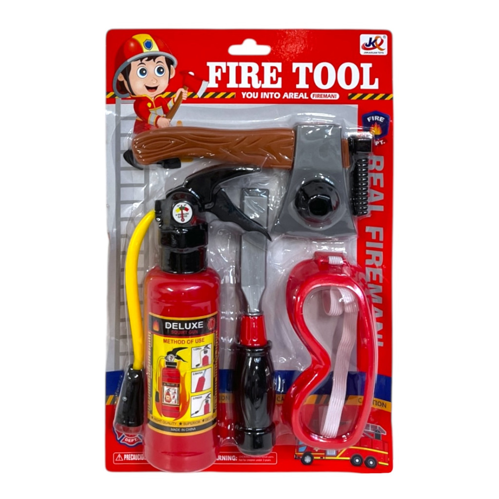 Játék tűzoltó szerszám készlet palackkal, védőszemüveggel és kiegészítőkkel. Kétféle összeállításban, 22x32 cm-es bliszter csomagolásban, szerepjátékhoz ideális.