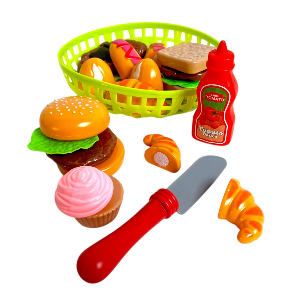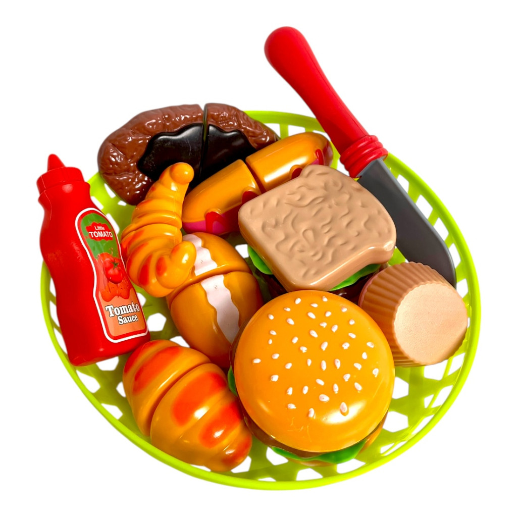 Játék vágható ételkészlet kosárral, biztonságos műanyag ételekkel és tépőzáras szeletelhető elemekkel. Ideális szerepjátékhoz és konyhásdihoz.