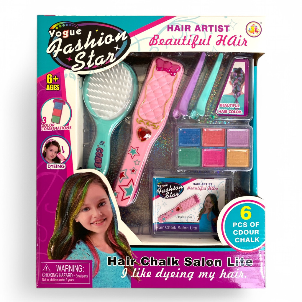 Válj igazi hajművésszé a Vogue Fashion Star készlettel! Ez a színes és csillogó hajkréta szett mindent tartalmaz, amire egy kis stylistnak szüksége lehet: 6 különböző hajszínező krétát, hajkefét, csipeszeket és egy játék hajvasalót, ami valóban úgy néz ki, mint az igazi! A praktikus kiegészítőkkel könnyedén varázsolhatsz szivárványt a tincsekbe, egyedi frizurákat készíthetsz és újra meg újra kipróbálhatsz más-más stílusokat.