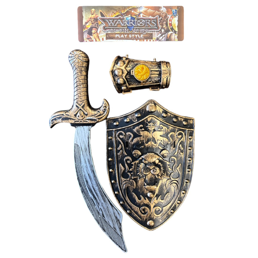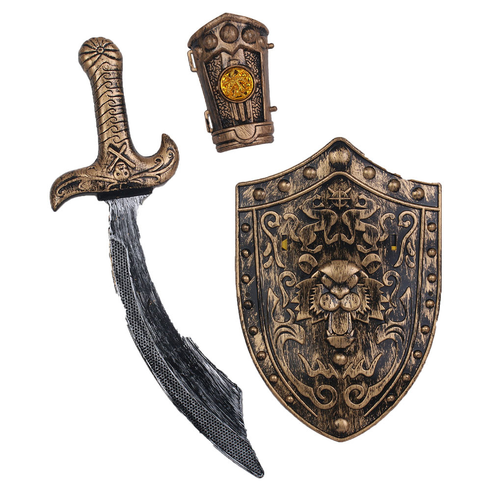 Ez a fantasztikus középkori harci szett minden kis harcos álma! A készlet egy lenyűgöző, ívelt pengéjű kardot, egy részletesen kidolgozott, oroszlán mintás pajzsot, valamint egy díszes arany elemekkel gazdagított kézvédőt tartalmaz. Tökéletes kellék egy középkori hős szerepéhez, legyen szó otthoni játékról vagy jelmezversenyről.