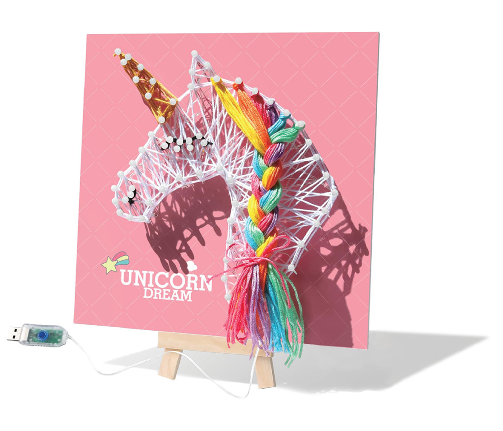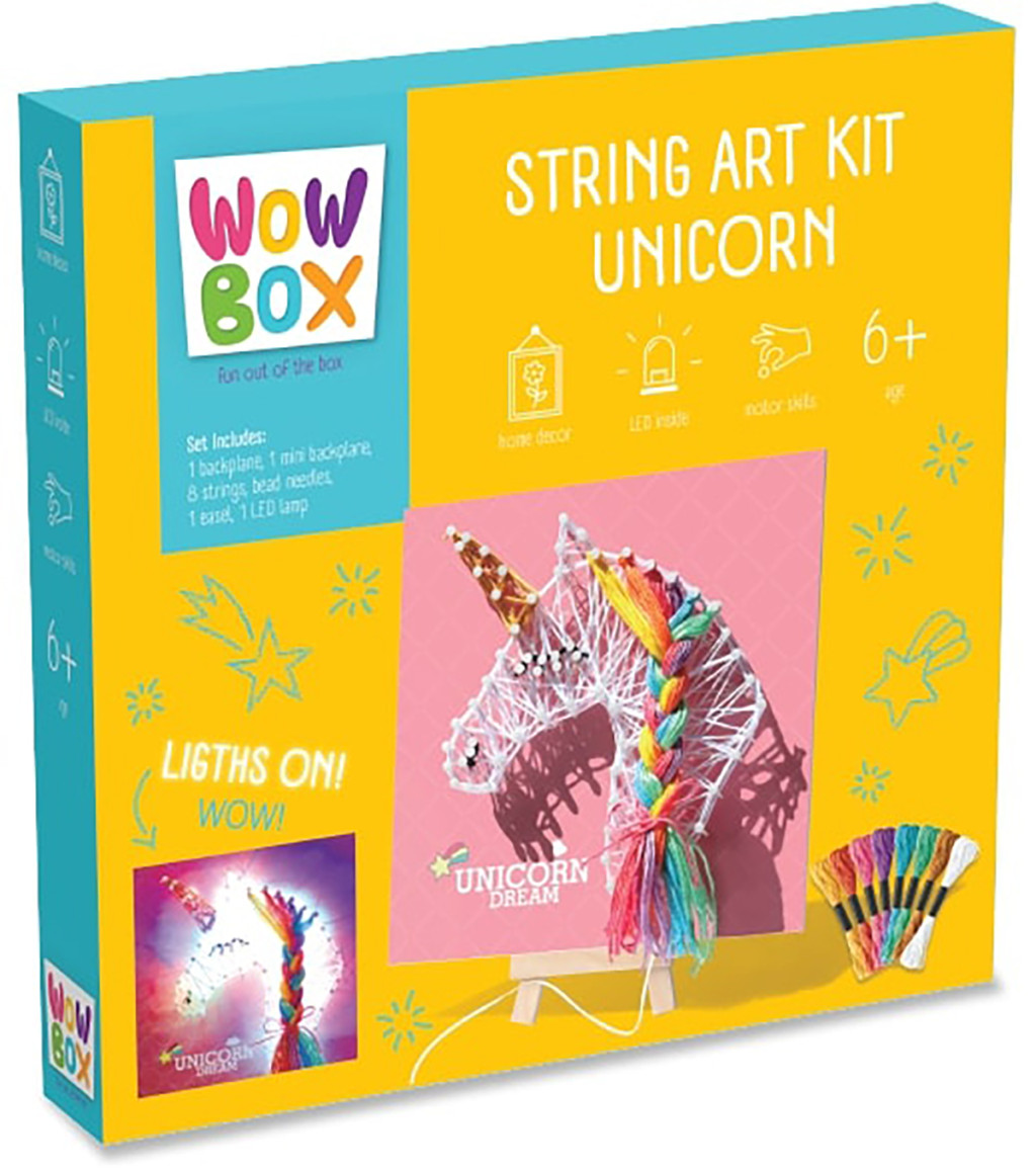 A készlet tartalmaz színes fonalakat, LED fényfüzért USB csatlakozóval, tűket és egy alapot, amelyre az unikornis alakzatot fel lehet fonni. Az egyszerűen követhető útmutató segít a gyerekeknek a kép elkészítésében, így lépésről lépésre saját kezűleg alkothatnak egy ragyogó unikornist. A LED fények extra varázslatot adnak az alkotásnak, így az elkészült fonalkép igazán különleges dekorációként szolgálhat a szobában.