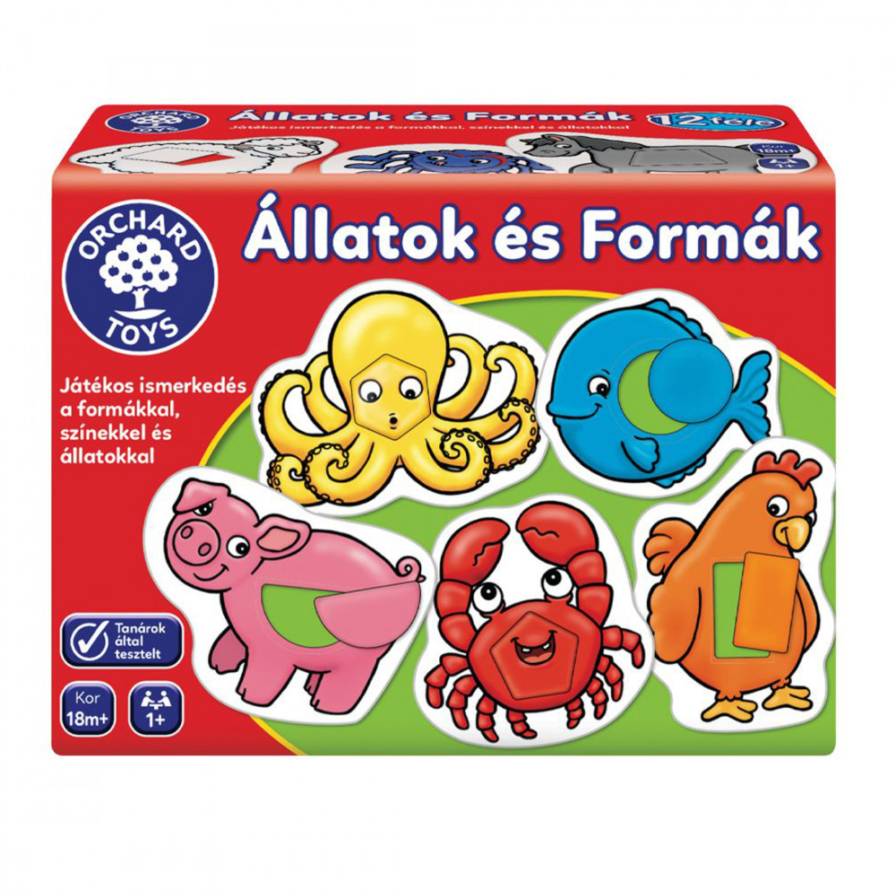 A 12 darabos Orchard játékkészlet kiválóan alkalmas a különböző geometriai formákkal, valamint színekkel és állatokkal való ismerkedésre.