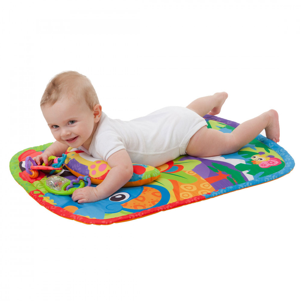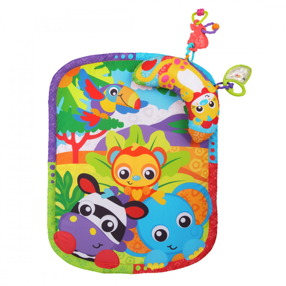 A Dzsungel játszószőnyeg bébijáték egy puha szövetből készült fekhely, amin a baba alhat, vagy akár játszhat is. A színes állatok azonnal felkeltik a picur figyelmét, a játék fejleszti az érzékszerveket, és a mozgást is.