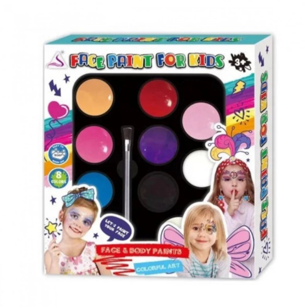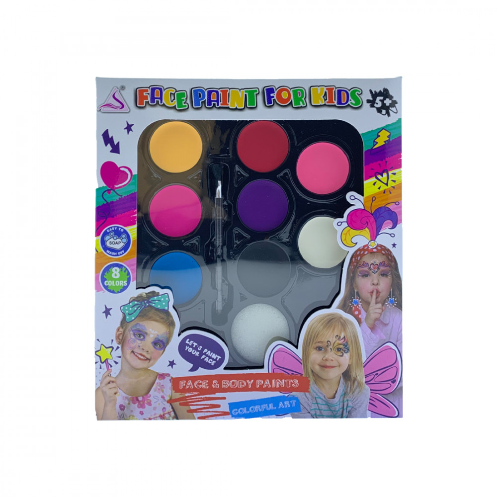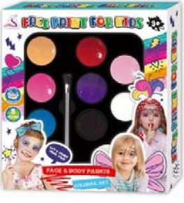 Arcfesték készletben 8 féle színnel, és egy kis ecsettel, kis szivaccsal. Használhatod az arcodra és a testedre is, szappannal könnyedén lemosható.