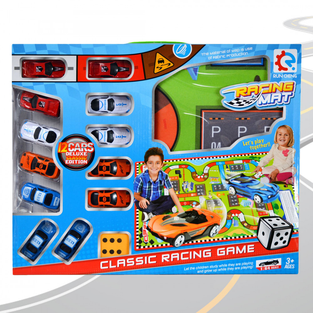 A társas tartalma: 12 db autó, egy dobókocka, egy szőnyeg