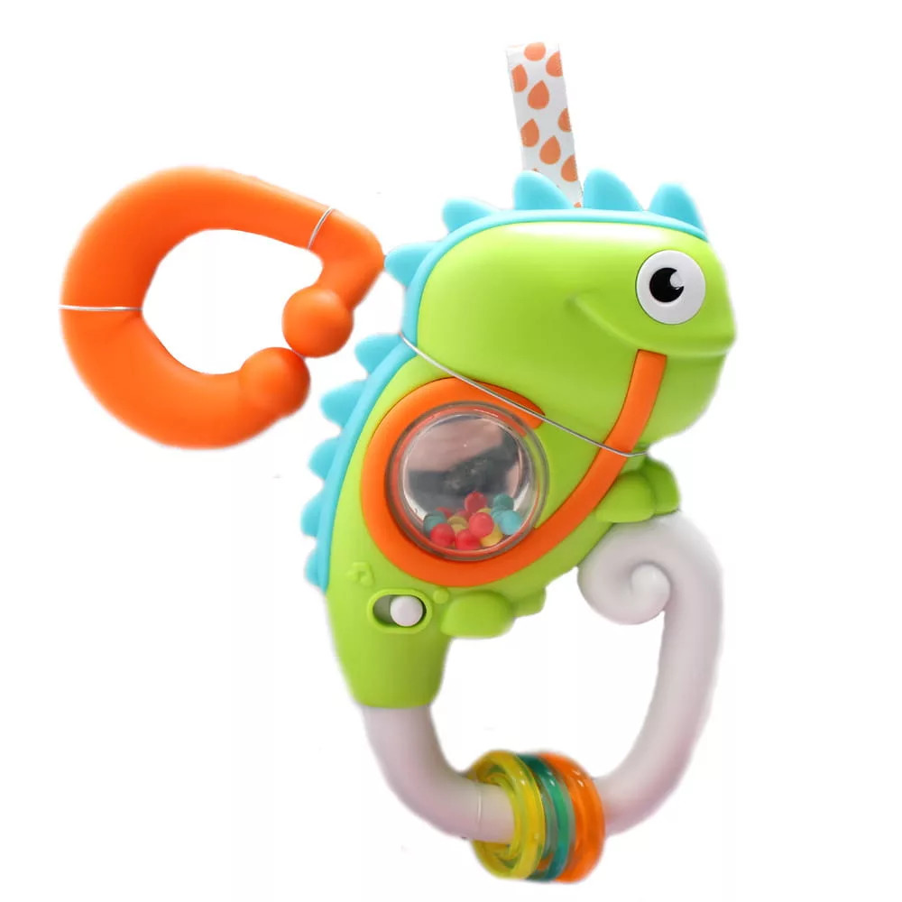 Ez a mulatságos kaméleon alakú csörgő a kisbabák kedvenc időtöltése lesz! A csörgő rázása mulatságos dallamokat és hangeffektusokat aktivál, míg a kaméleon hasában lévő színes golyók felkeltik a gyermek figyelmét, serkentik az érzékelést. A praktikus horog tökéletes a csörgő felakasztására és hordozására.