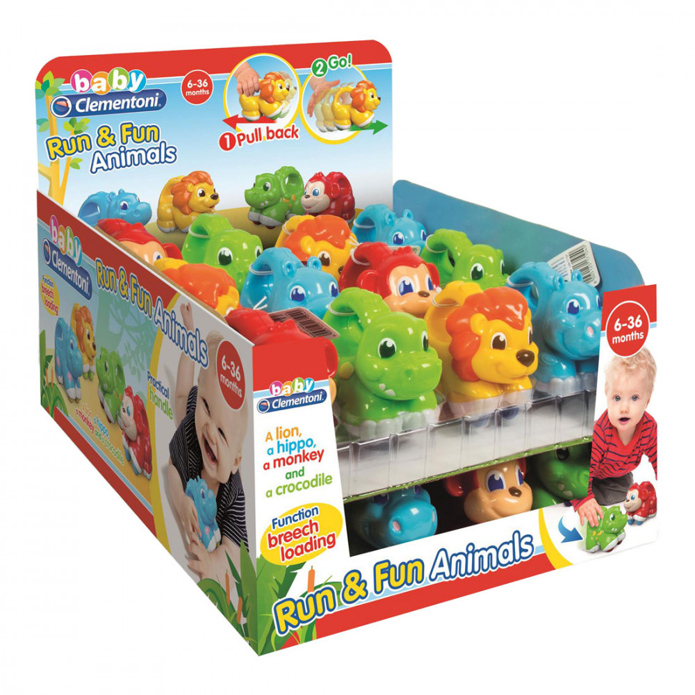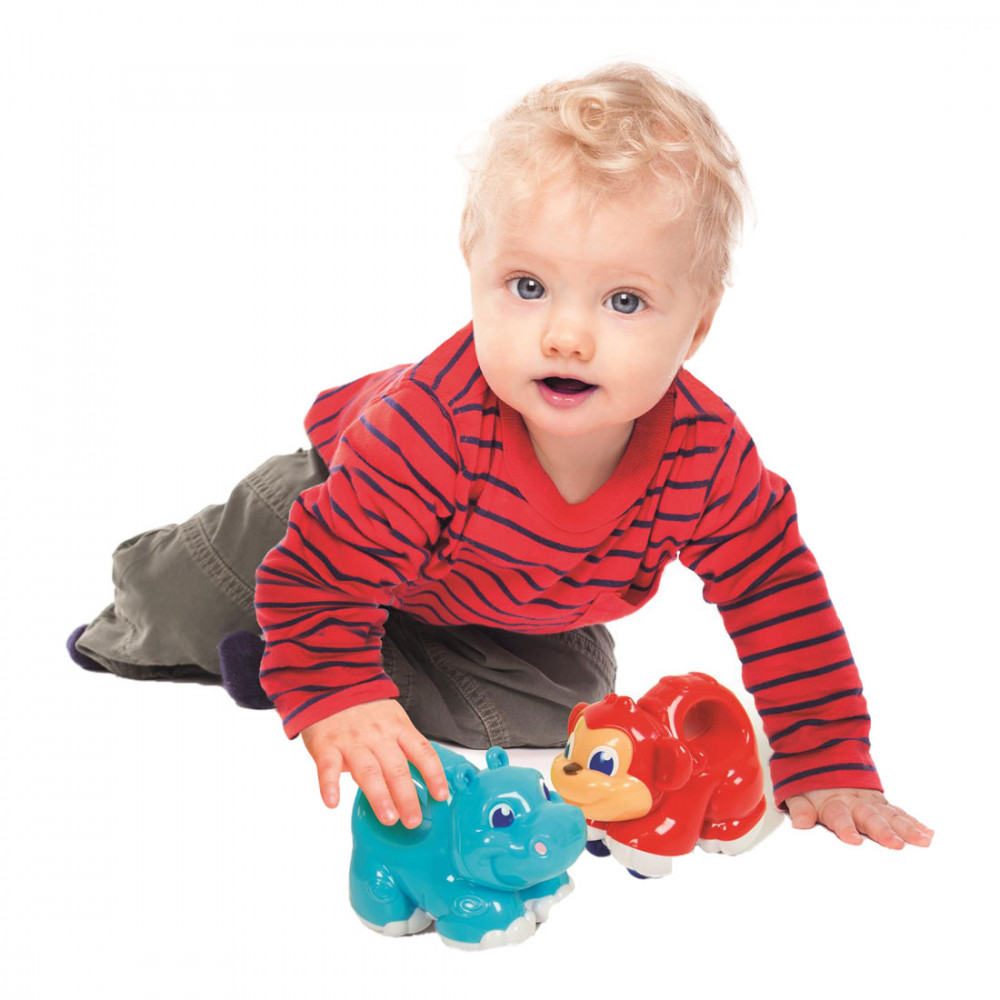 Oroszlán, víziló, majom és krokodil. Négy szimpatikus állat a szavannáról, amelyek teljes sebességgel szállnak a szórakoztató visszahúzási funkciónak köszönhetően. A nagy, könnyen megfogható fogantyú segít a gyermeknek megragadni az állatokat, visszahúzni és elindítani. Támogatja a gyermekek manuális képességeinek fejlődését, az ok és okozat összefüggések felismerését.