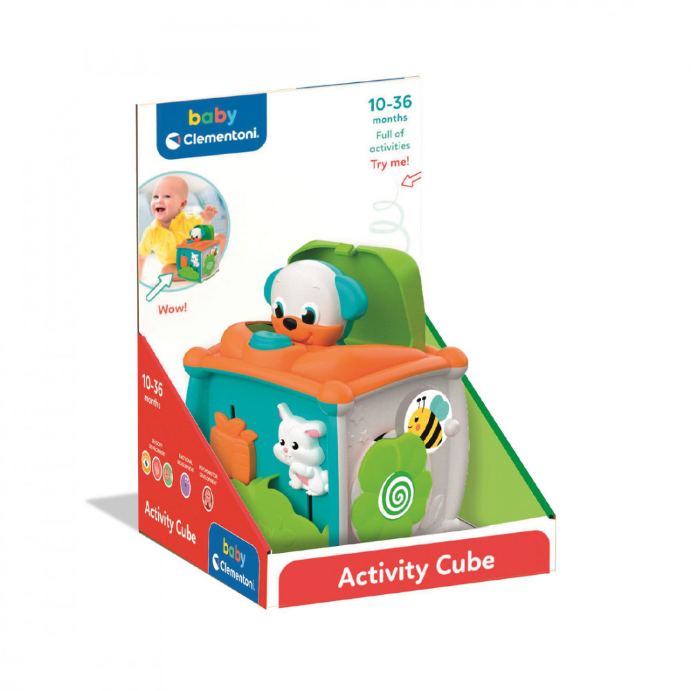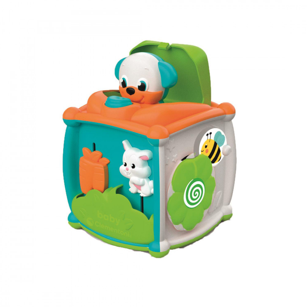 Egy varázslatos kocka, tele meglepő tevékenységekkel, amelyek csak arra várnak, hogy felfedezd őket. 5 különböző funkciójú játékterületet tartalmaz, amelyek segítenek a gyermeknek, hogy egyszerre csak egy tevékenységre koncentráljon, így javítva a koncentrációját. Nyomd meg a gombot a fedél kinyitásához, és egy kiskutya ugrik elő, garantált meglepetéshatásként! A virág forgatása a méheket mozgásra és repülésre készteti. A nyuszi felugrik, hogy megragadja a répát, míg a kis hal a lapot forgatva kukucskálós hatást kelt. A kocka érzékszervi ingereket használ, elősegíti az ok-okozati összefüggéseket, serkenti a finom-motorikus készségeket és felkelti a gyermekek kíváncsiságát.