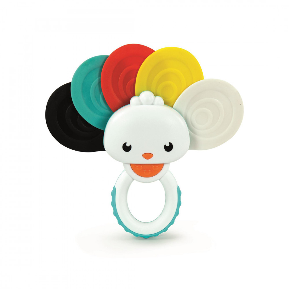 Egy igazán különleges csörgővel lepheted meg gyermekedet, mely színes megjelenésébel biztosan tetszeni fog majd gyermekednek. A csörgő páva megjelenést kapott, farktollai pedig színes megjelenést kaptak, melyeken kiemelkedő formák láthatóak. Ezek segítségével gyermeked tapintása, motorikus mozgása és fogása is fejlődik majd. A csörgő hangot hallgatva a hallása is fejlődik majd, így mókás, és rendkívül hasznos is számára ez a játék.