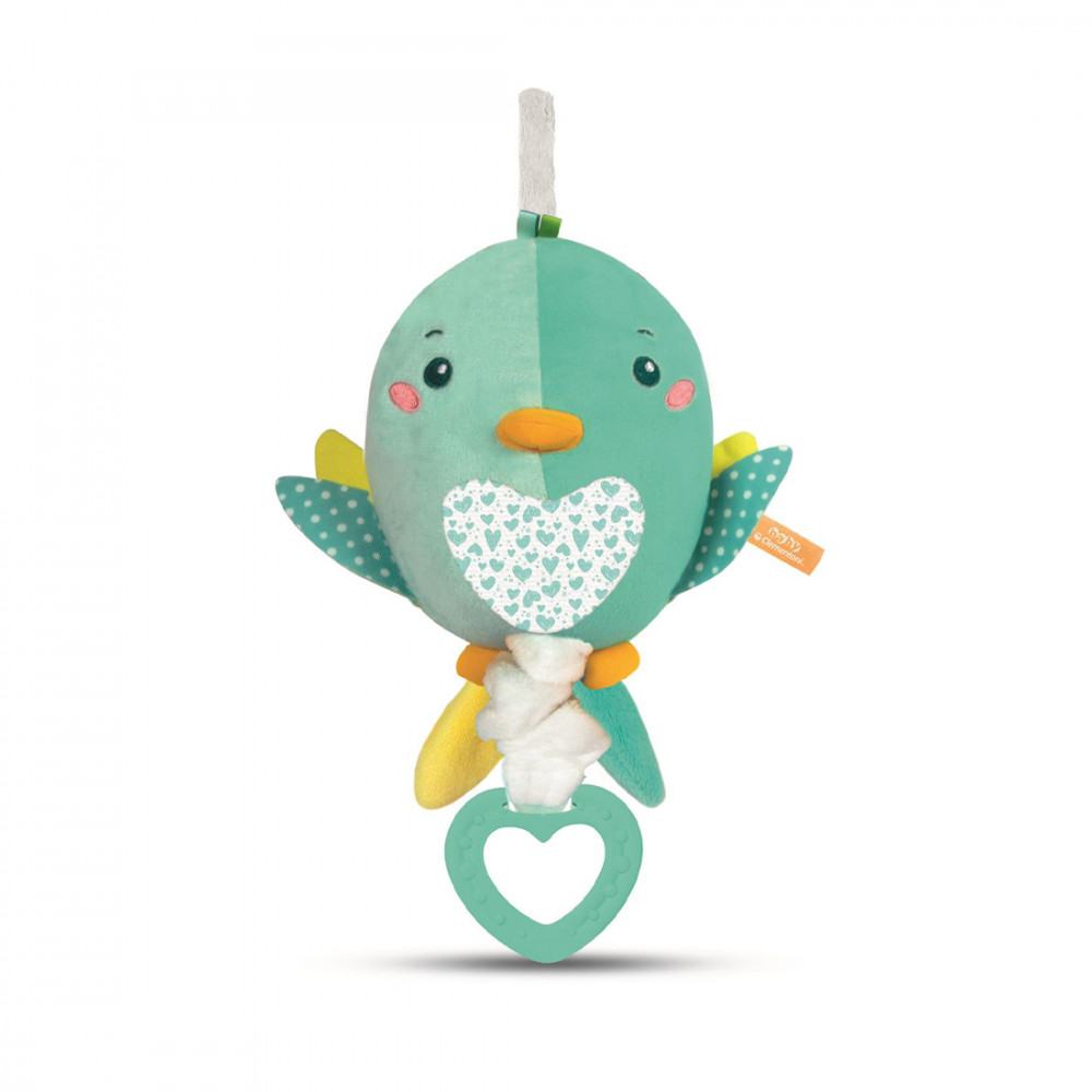 Ez a barátságos Zenélő plüss Madárka lágy Brahms dallamainak köszönhetően biztosan megnyugtatja a babákat és segít álomba ringatni őket. Az élénk színek, a puha textúrájú felületek, valamint a Madárka testéről lelógó szív alakú rágóka - amit meghúzva dalra fakad a plüss - sokáig lekötik a kicsik figyelmét és serkentik a tapintás érzékelését is. A kellemesen puha anyag és a barátságos figura ölelgetnivaló, bőrbarát anyaga pedig jól magába szívja a nedvességet, így nyálkendőnek is kiváló. A puha rágóka pedig könnyebbséget hozhat fogzáskor a babáknak. A kényelmes tépőzárnak köszönhetően a zenélő plüss egyszerűen rögzíthető a baba kiságyához, bölcsőjéhez, vagy utazás közben a hordozóhoz, babakocsihoz.