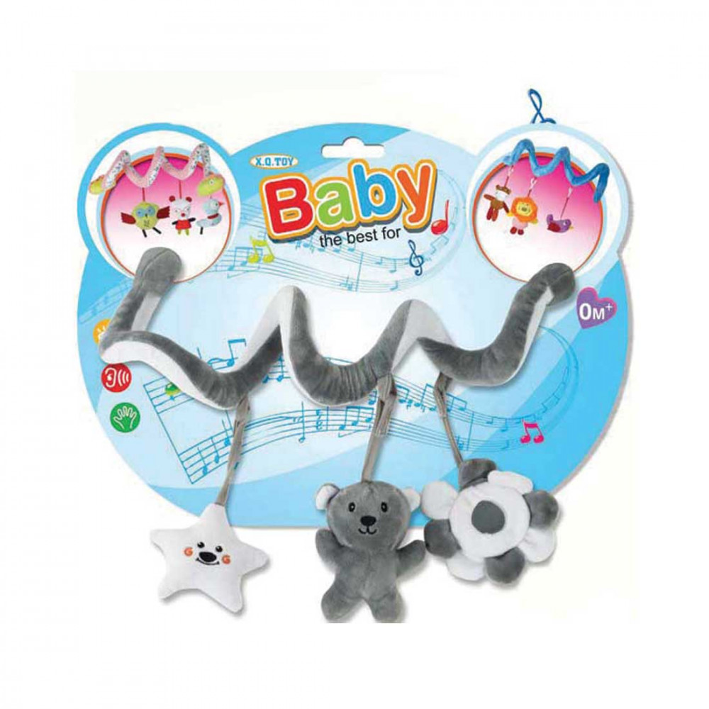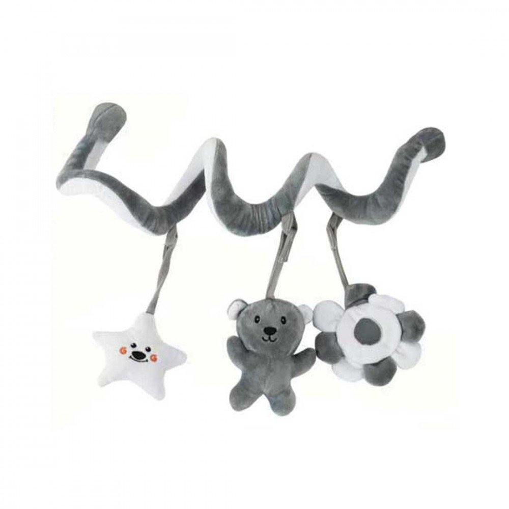 Ez a bébi plüss csörgő spriál alakja lévén felhelyezhető babahordozóra, babakocsira vagy éppen a bababágy rácsaira. Fejleszti a gyerekek fantáziáját, szem és kéz koordinációját. A rajta lécő macinak és formáknak köszönhetően a gyerkőc megtanulja felismerni a színeket, formákat.