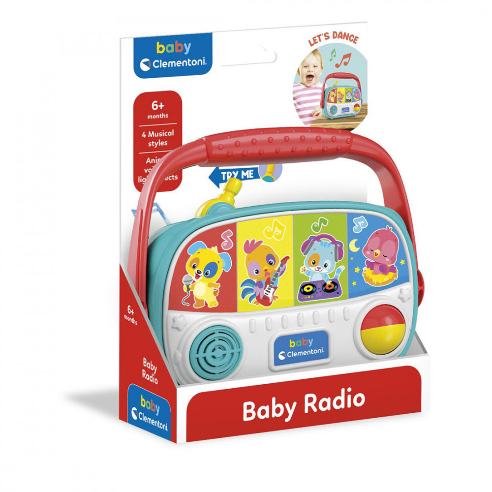 Rádió formájú interaktív játék a Clementoni-tól! A négy gomb egyikének megnyomásával különböző stílusú zenéket játszhat le csemetéd! Minden gombon egy-egy állat képét találhatjátok meg: pop - kutyus, rock - kakas, rap - cica, nyugató dallamok - kismadár. A kisgyermekek könnyen magukkal vihetik ezt a prkatikus fogantyúval ellátott, prméium minőségű rádiót!