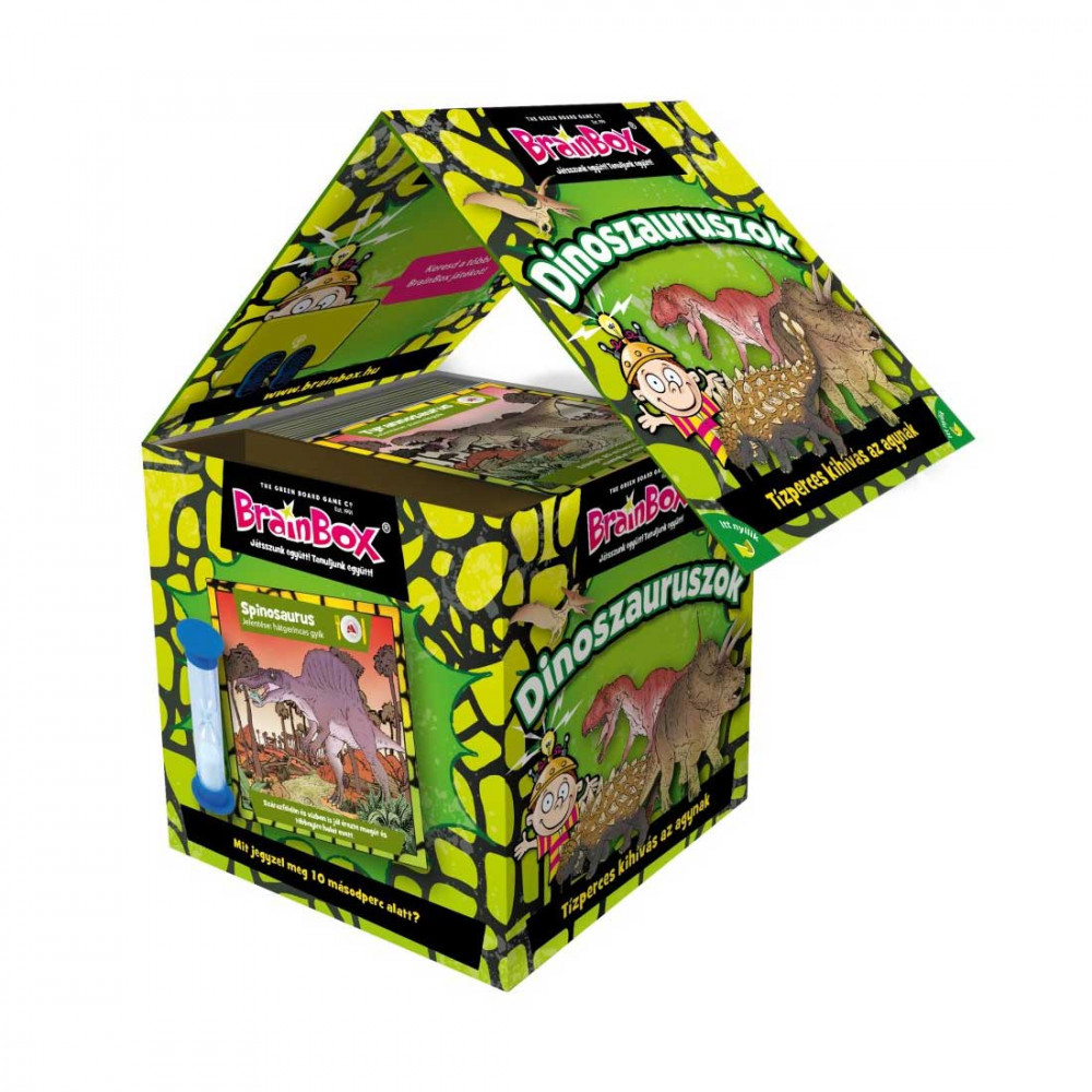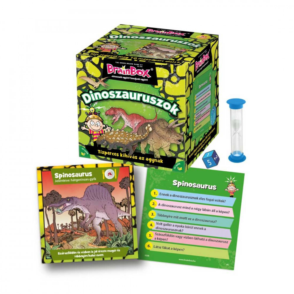 A BrainBox Dinoszauruszok kiadásával játszva tudhatsz meg új információkat a dínókról. Húzz egy kártyát, és 10 masodperc alatt jegyezd meg, mit látsz rajta. Ezután fordítsd le a kártyát, és válaszolj a kérdésre, amelyik a dobókockával kidobtál! És vigyázz, mert válaszolnod is időre kell! A doboz 55 kártyát tartalmaz.