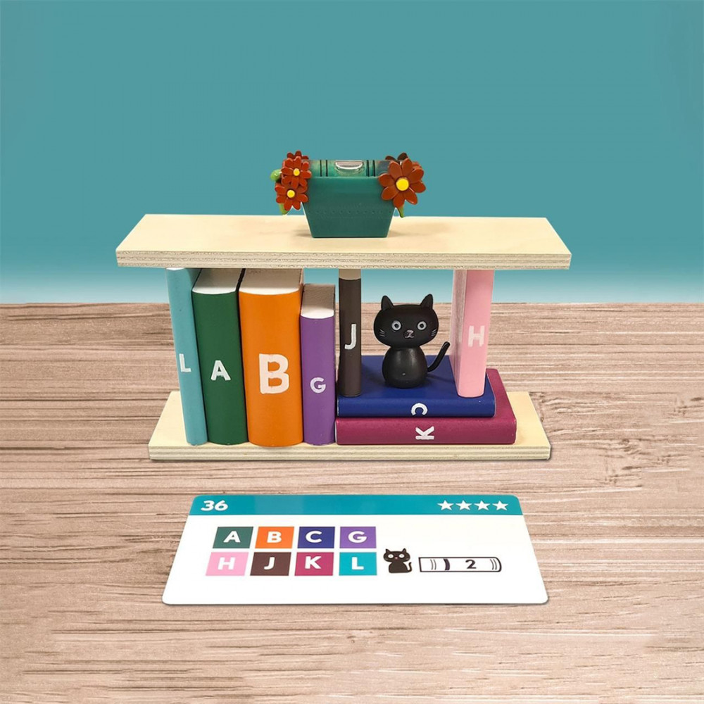 A feladatod, hogy megfelelően rendezd a könyveket az alsó polcra úgy, hogy a felső polc tökéletesen vízszintes legyen felettük. Válassz egy feladványkártyát, majd kezd el felpakolni a feladatban meghatározott betűkkel jelölt könyveket az alsó polcra. Némely feladat csak a könyvek számát írja elő. Amit tarts észben: