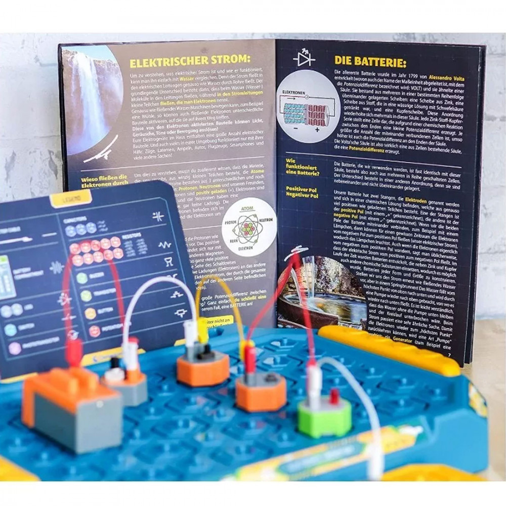 A készlet különféle alkatrészeket tartalmaz, például vezetékeket, kapcsolókat, égőket és más áramköri elemeket, valamint egy részletes útmutatót, amely lépésről lépésre vezeti végig a gyerekeket az egyszerűbb és összetettebb áramkörök megépítésén. A játék során megismerhetik az elektromos áram működésének alapelveit, és betekintést nyerhetnek a fizika alapvető fogalmaiba.