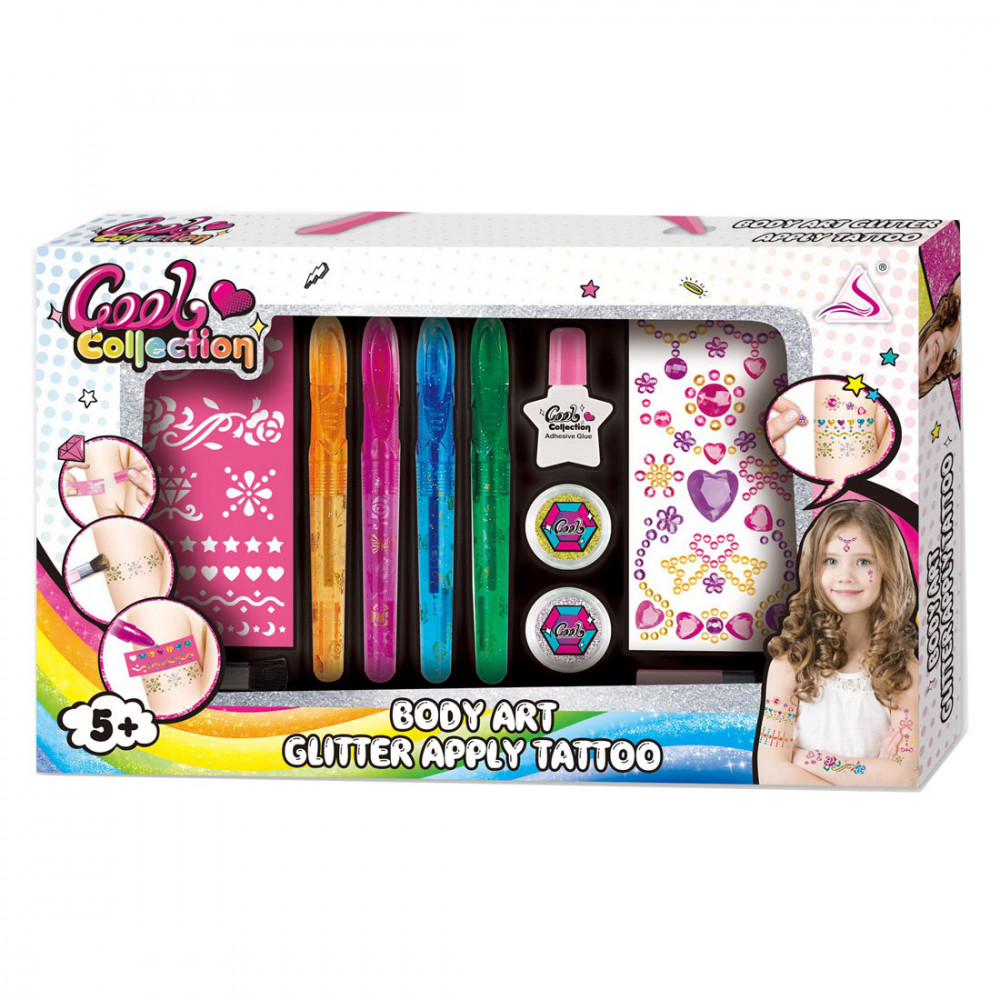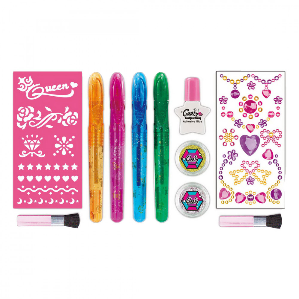 Ez a készlet lehetővé teszi a gyermekek számára, hogy kreatívak legyenek és csillogó tetoválásokat készítsenek egymásnak és maguknak, valamint matricákat ragasszanak fel. A készlet 4db tetováló tollat és sablonokat is tartalmaz.