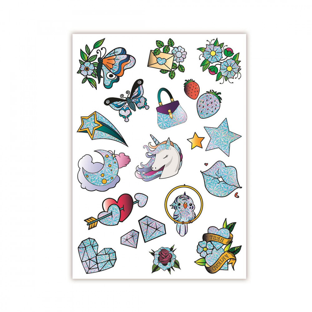 Csillámos és fluoreszkáló tetoválások egyben Könnyen felvihetők, biztonságosak a bőrre Divatos, lányos minták – unikornis, gyűrű, csillag stb. Ideális szülinapra, buliba vagy hétvégi mókázáshoz 6 éves kortól ajánlott
