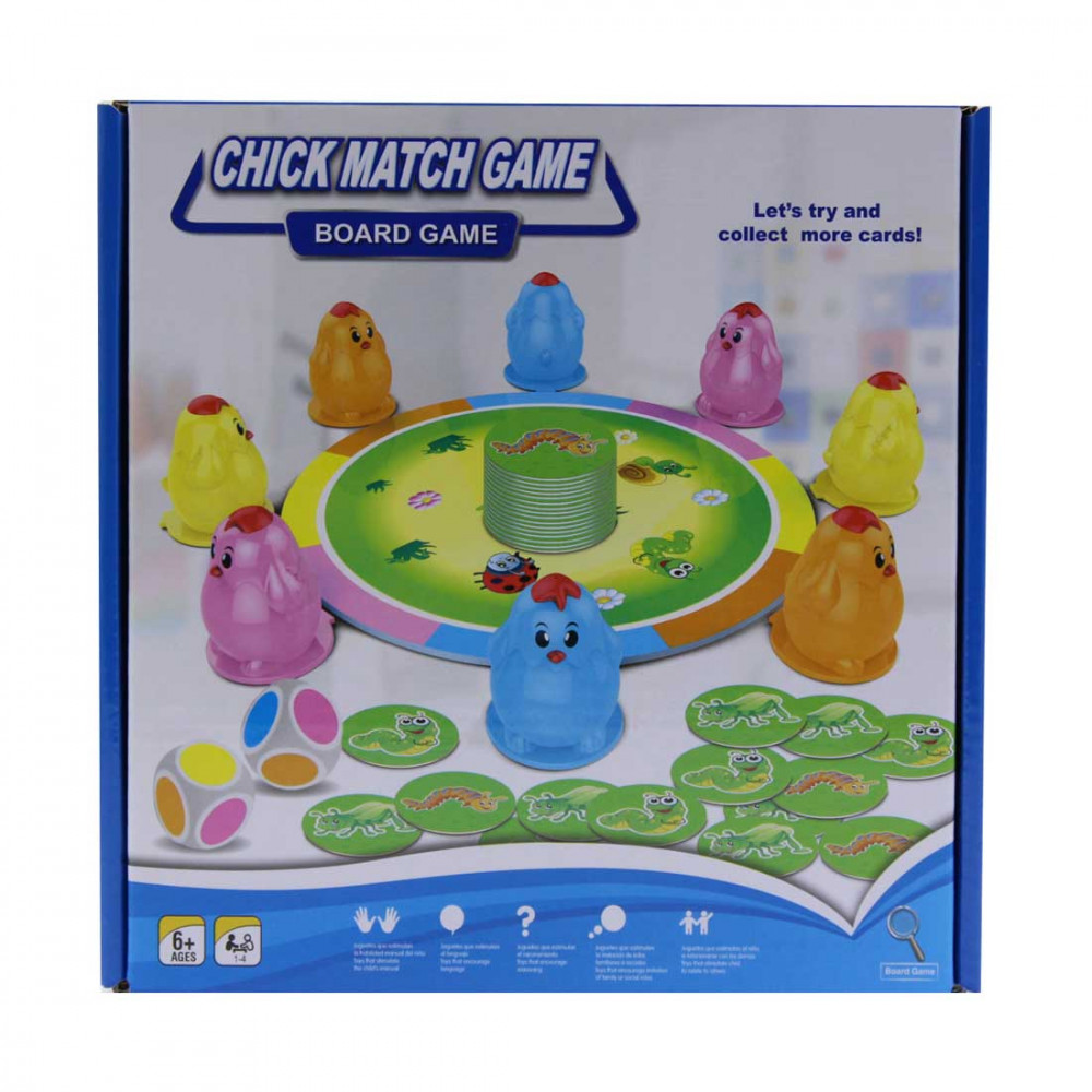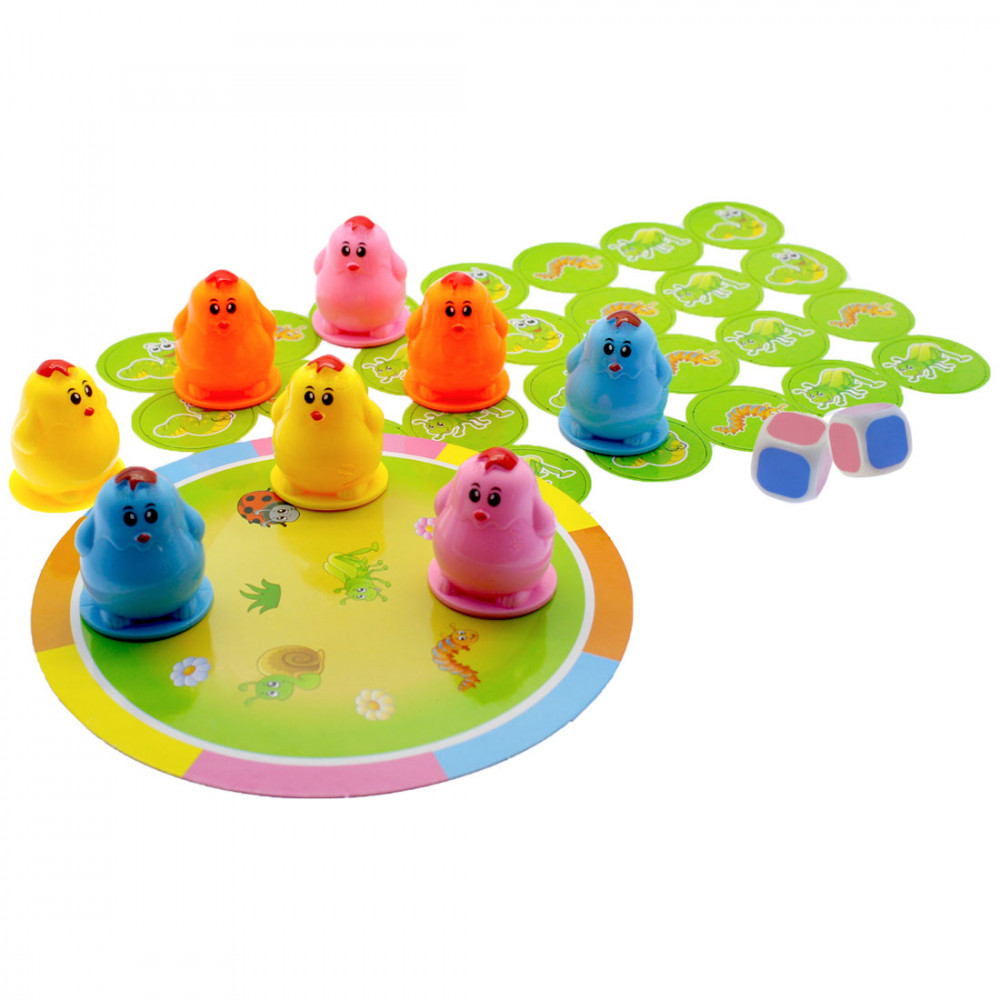 A csirkés társas lényege, hogy a tábla szélére helyezett csirkéket kell forgatni a színes dobókockákkal történő dobás szerint. Aki a tábla felé néző csirke színével azonos színűt dob, az ételkártyát kap. Akinek összegyűlt 5 ételkártyája, megnyert a játékot. A játék csomagolási mérete 22,5x21x5,5 cm. A játék tömege 320 g.