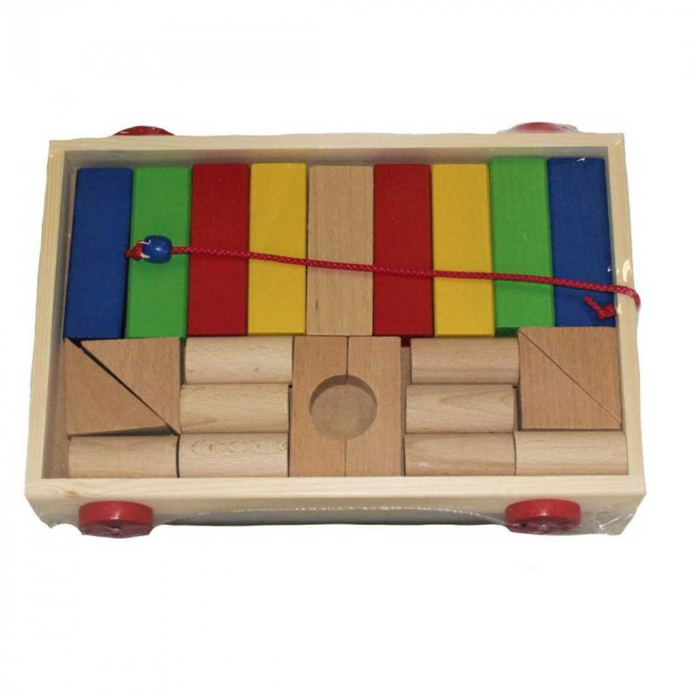 Ebben a fa építőkészletben az elemek egy kis húzós kocsiban vannak, ezért a játék elpakolása, és mozgatása egyszerű. A fa építőelemekkel pedig szórakoztató a játék.