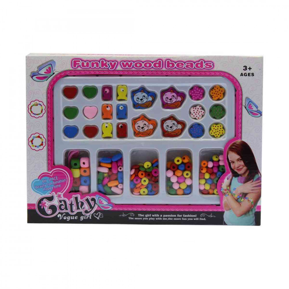 A fa gyöngyfűző készlettel rengeteg egyedi nyaklánc és karkötő készülhet. Többféle fa gyöngy különböző formákban, mintákkal, hogy minden kislány megtudja valósítani az elképzelését.