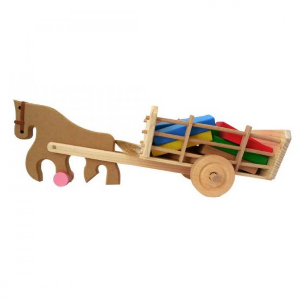A színes, fából készült építőelemeket egy fa lovacska húzza fa szekérben. A játék végén könnyebb rávenni a kicsit a rendrakásra, ha a szekérbe kell visszapakolni a játékokat, és a lovacskával húzni a helyére.