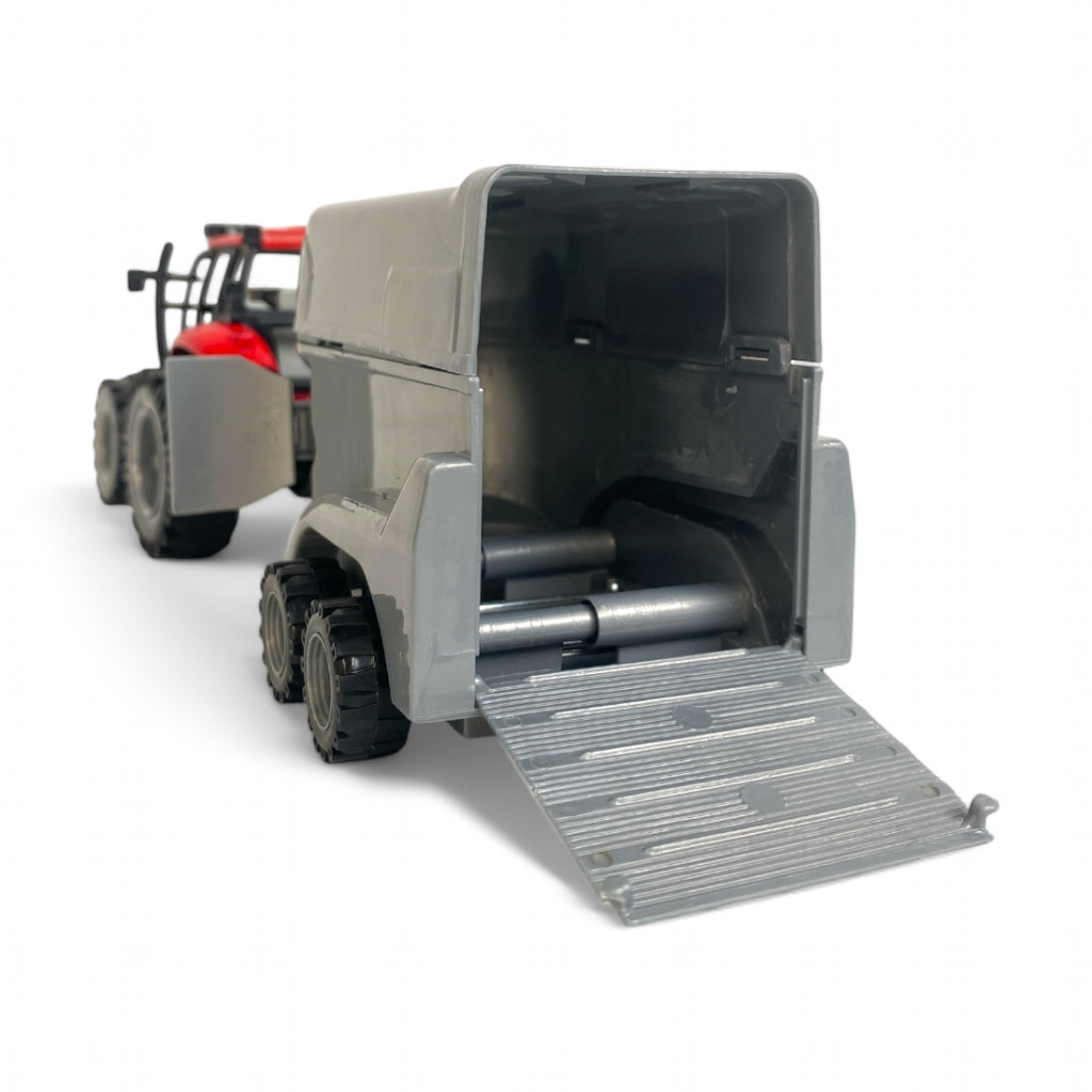 - Két különböző színben – választható piros-fekete vagy zöld-fekete kivitelben.- Lószállító utánfutó – nyitható hátsó rámpával, hogy a lovak könnyedén be- és kisétálhassanak.- Masszív gumikerék design – hogy bármilyen terepen könnyedén gurulhasson.- Részletes traktor kialakítás – valósághű vezetőfülke, kormánykerék és motorháztető.- Interaktív játékélmény – segíti a gyerekeket a szerepjátékban és a képzelőerejük fejlesztésében.