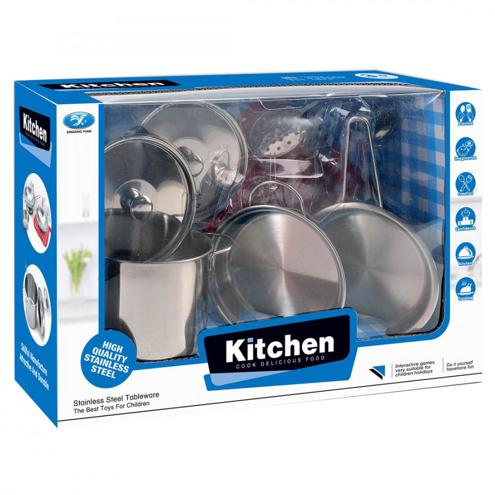 Ez a fém edénykészlet egy kiváló játék a kis konyhafőnökök és kis szakácsok számára, akik szeretnek játszani a konyhában. A fém edénykészletben minden megtalálható, amire a gyermekednek szüksége lehet ahhoz, hogy elkészítse a saját "ételkölteményeit."