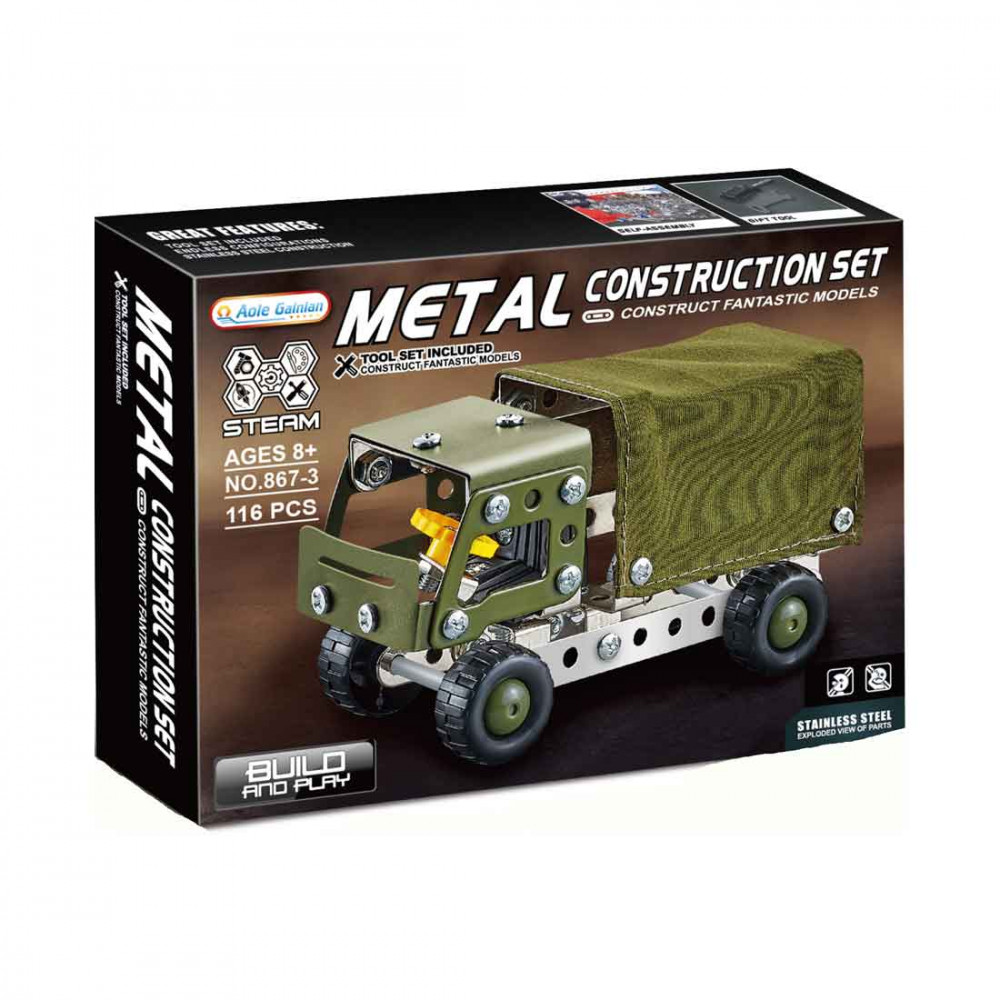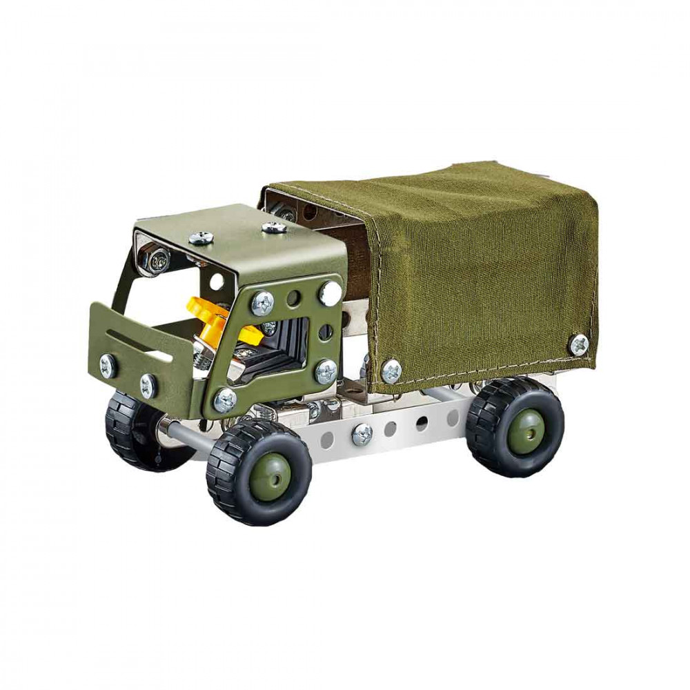 Fedezd fel a fémépítő készlet izgalmas világát, és építsd meg saját ponyvás katonai autódat! Ez a készlet lehetővé teszi számodra, hogy a képzelőerődet és kreativitásodat kamatoztatva létrehozd a saját kis hadsereg autóját, amely kész arra, hogy a játékteret meghódítsa.