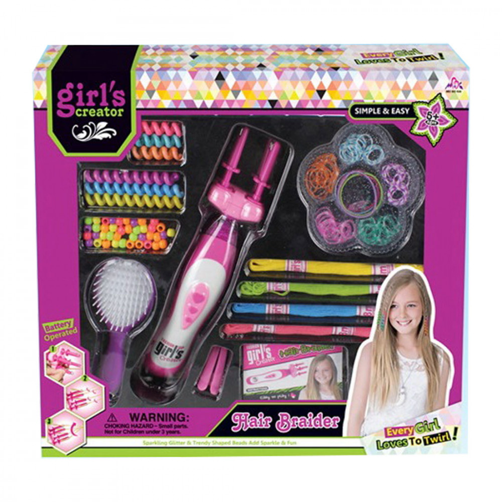 Készíts csodálatos frizurát ezzel a hajdekoráló készlettel. A csomagban van egy elemmel működő hajfonó gép, hajgumik, gyöngyök, fésű és egyéb csodás kiegészítők.