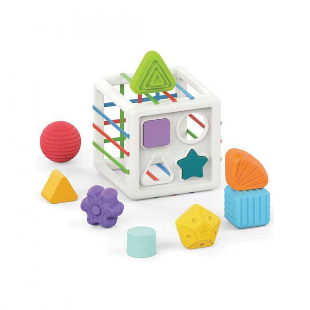 Ez a formaillesztős bébi játék tökéletes korai fejlesztő játék, ami a kicsik tapintására, vizuális- és kognitív képességeire is nagyon jü hatással van. A dobozban egy kocka alakú, színes gumiszalagokkal ellátott gyűjtődoboz található, melyben különböző formájú és struktúrájú forma található. Ezeket a gyerekek be tudják tenni a gumiszalagokon, illetve a műanyag alakzat réseken keresztül a kockába. Közben fejlődik a finommotorikus képességük, a szem- kéz koordinációjuk, a logikus gondolkodásuk, valamint megtanulják a színeket és alakzatokat is!