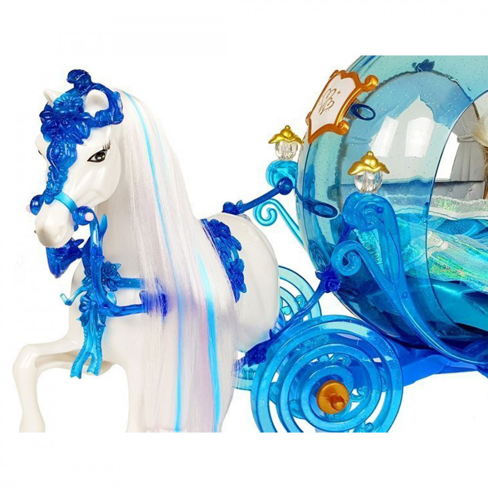Garantáltan le fogod nyűgözni bármelyik kislányt ezzel a szuper óriás tökhintóval, amihez egy 29 cm-es Hamupipőke baba is jár. A paripa sörénye szivárványszínű, a szerszám virágos, a baba ruhája pedig sellőfényes kék báli ruha.