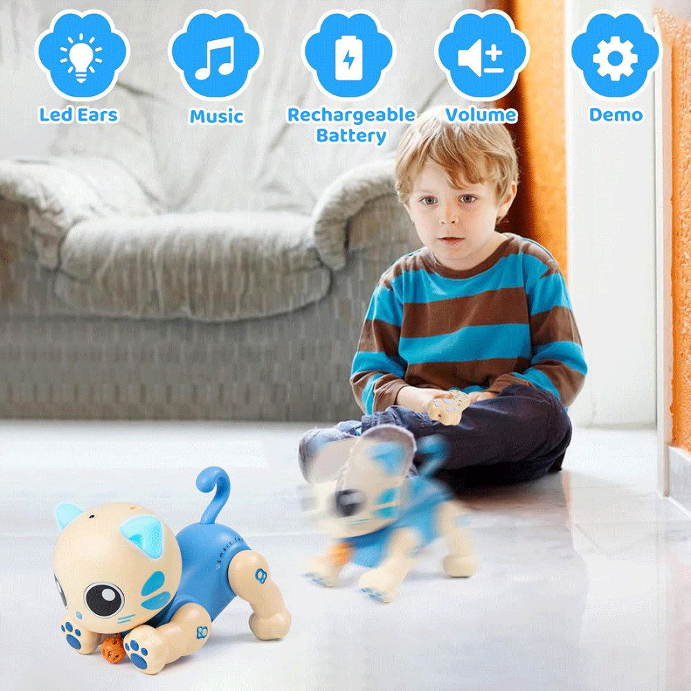 Intelligens macska több funkcióval: Ez a robotállat aranyos és szórakoztató játék gyerekeknek. Tud ülni, előre sétálni, megállni, fekvőtámaszt és kézenállást végezni, énekelni és táncolni. 50 műveletet programozhat, válaszol a parancsaira.A gyerekek interakcióba léphetnek ezzel a macskás robotjátékkal. Ha tapsol, zenét és táncot ad elő. Érintse meg az állát, a macska hangját és aranyos akcióit fogja hallani. Szuper társ a gyermekek számára.