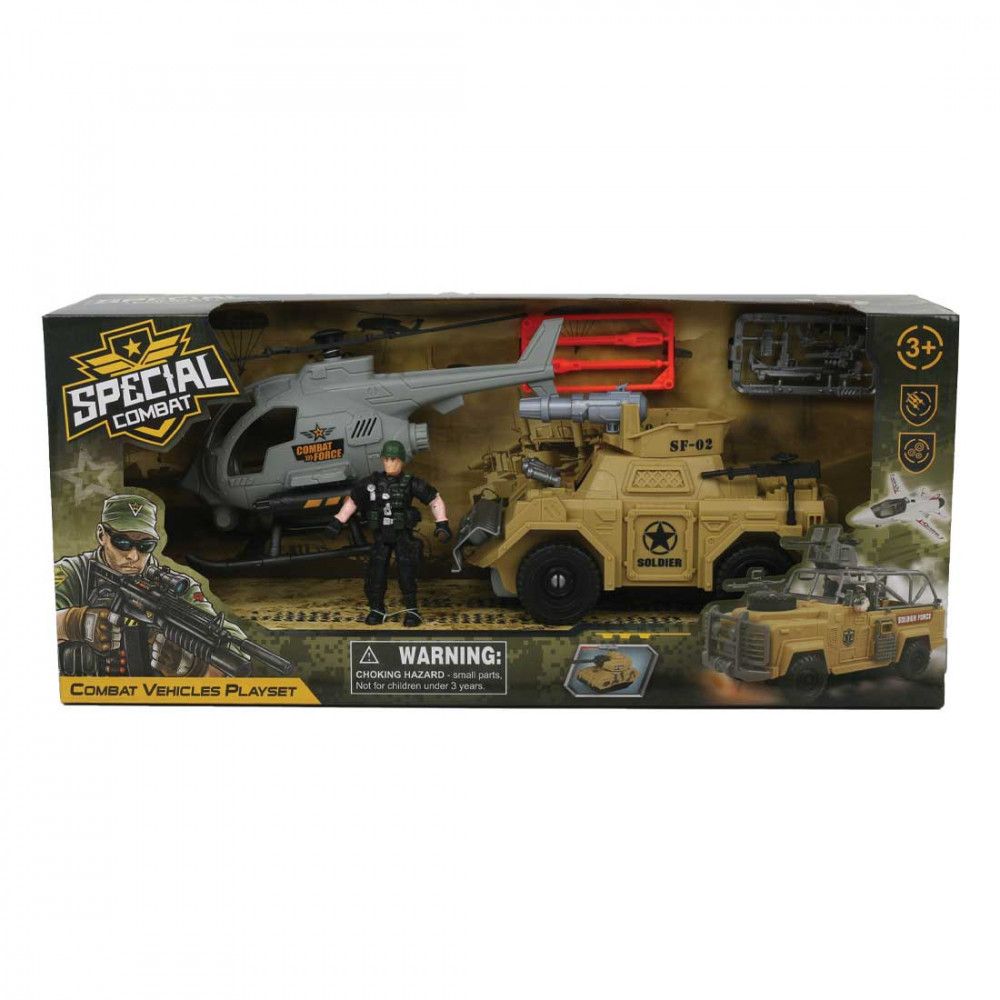 Ebben a kelikoptert és a tankor tartalmazó játék készletben részletgazdag kialakítással rendelkező harci járműveket találhat gyermeked, melyekkel azonnal megkezdheti a játékot. A helikopter rotorja forgatható, a tank tornya szintén 360 fokban elforgatható. A készletben található katonák szintén részletgazdag kialakítással rendelkeznek, melynek köszönhetően élethű megjelenéssel bírnak a játék közben.