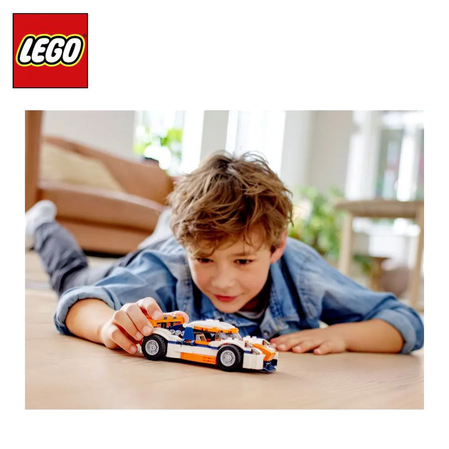 LEGO Creator - Sunset versenyautóLegyél gyorsabb, mint az ellenfelek, légy te az első aki áthalad a célvonalon a LEGO Creator Sunset versenyautóval! A gyors sportkocsi lenyűgöz majd a nagy légbeömlővel ellátott áramvonalas karosszériájával, színezett szélvédőjével, gumiabroncsaival és a mutatós, figyelemfelkeltő narancssárga, fehér és sötétkék színkombinációjával. Száguldj a versenypályán egy klasszikus nyitott versenyautóval vagy versenyezz a széllel a motorcsónakban! A LEGO Creator 3 az 1-ben készlettel a szórakozás soha nem ér véget!