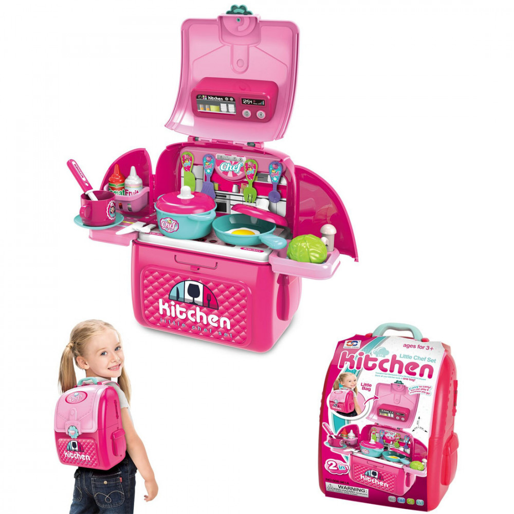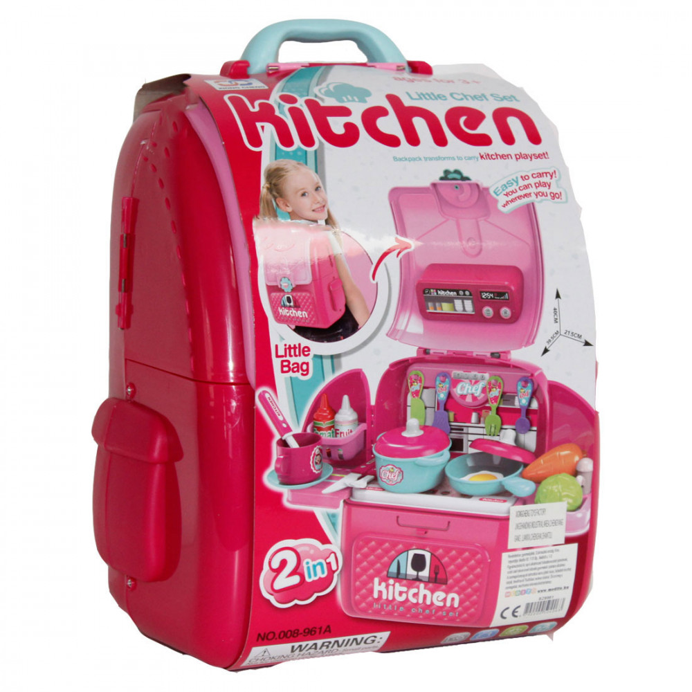 Ebben a hátizsákban egy komplett kis konyha rejtőzik kiegészítőkkel. Nyisd ki a hátizsákot, állítsd fel a konyhapultot, és indulhat is a főzőparty! Mit készítesz a vendégeknek? Ha már minden vendég elment, nincs más dolgod, mint visszapakolni a táskába, így könnyedén el tudod vinni a teljes konyhát akár a barátnődhöz is, hogy együtt játszhassatok.