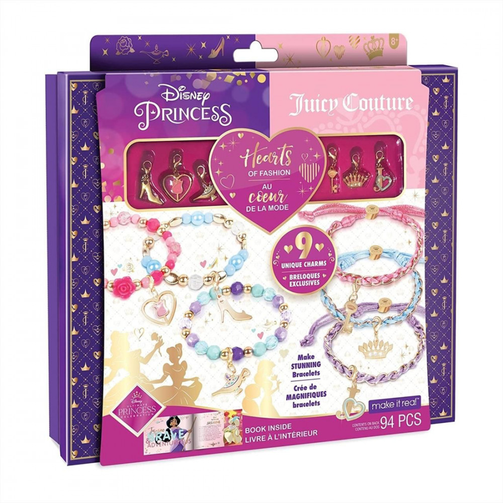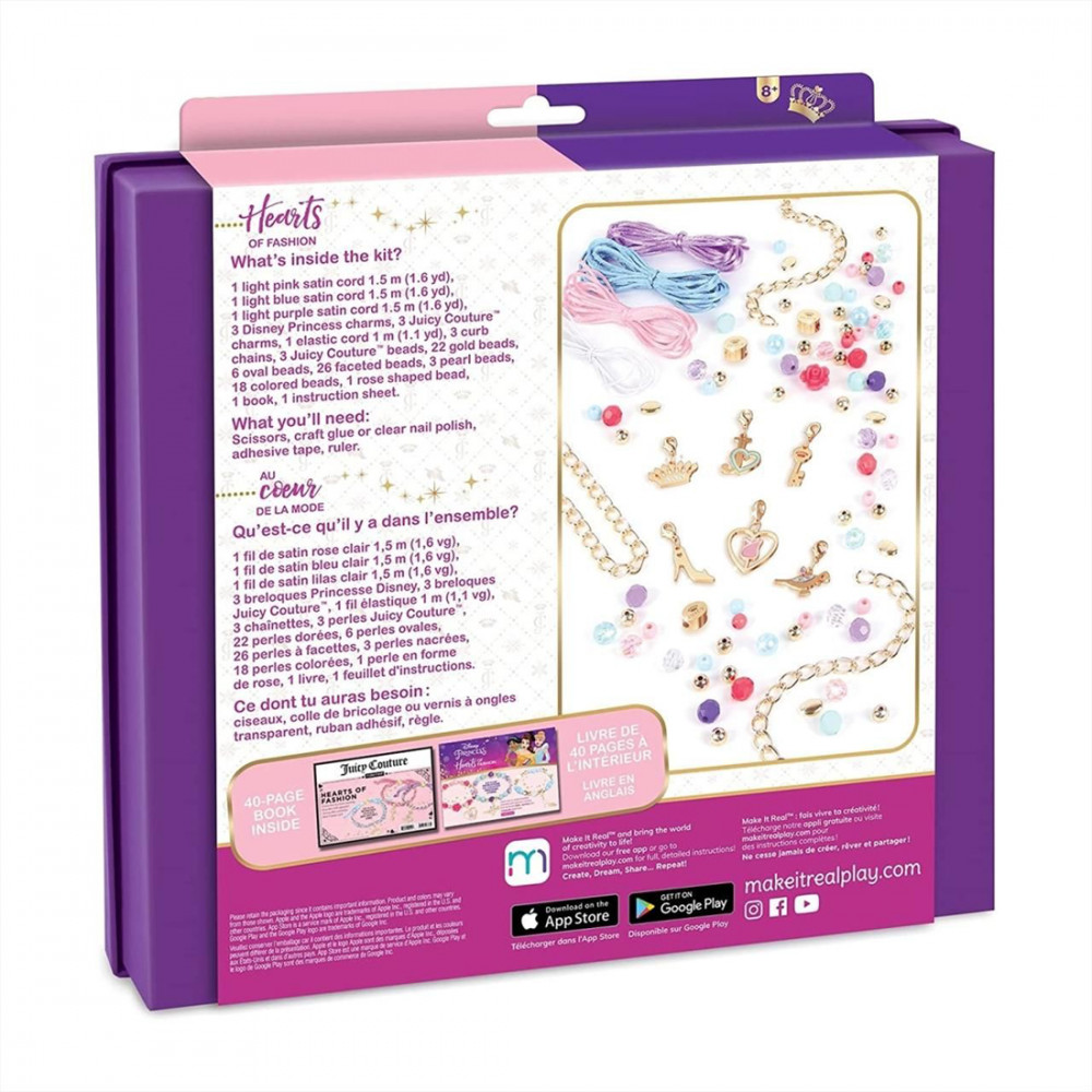 Két ragyogó ékszerkészítő szett egy csomagban! Ez a Make It Real szett egyszerre hozza el a Disney hercegnők legendás csillogását és napjaink legtrendibb ékszer divatjait. A Make It Real Disney hercegnők Juicy Couture a divat szívével hódít. A 94 darabos szettben színes fonalakat, láncokat, gyöngyöket, csatokat és medálokat találsz, melyekből akár 9 csodás karkötőt is elkészíthetsz, és egy használati útmutatót, amiből megtanulhatod az ékszerkészítés fortélyait, vagy ihletet meríthetsz saját ötleteid megvalósításához.
