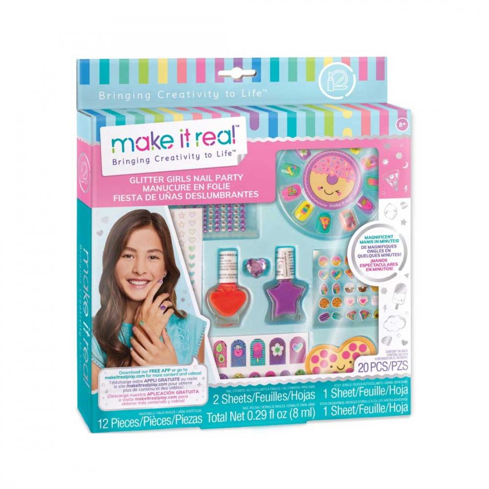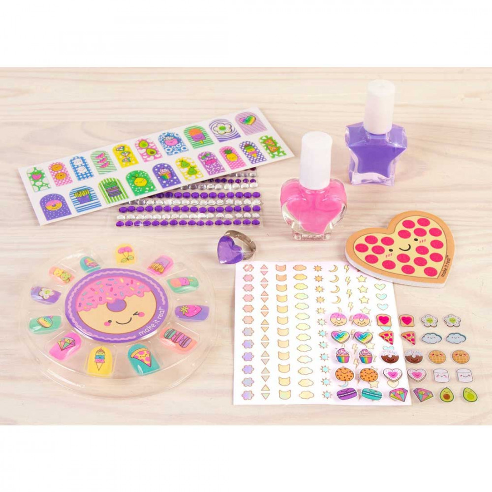 Készíts percek alatt csodálatos körmöket magadnak! A készletben találsz hozzá izgalmas körömlakkokat, színes műkörmöket, körömmatricákat és ékköveket. A csillogó körmökhöz stílusos gyűrűt és fülbevaló matricákat is találsz a szettben, hogy a megjelenésed tökéletes legyen!A készlet tartalma:- műkörmök- körömlakk, 2 színben- 2 ív körömmatrica- ékkövek- fülbevaló matricák- körömreszelő- műanyag gyűrű- útmutató