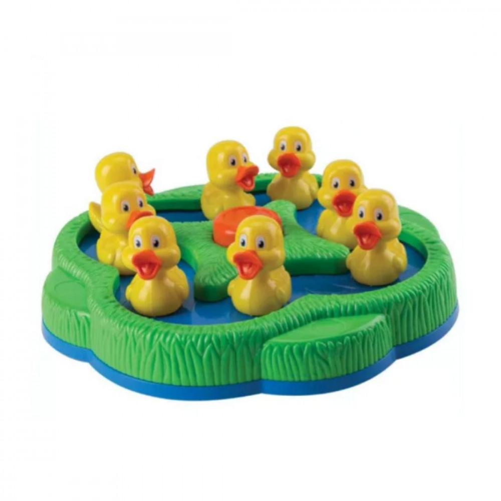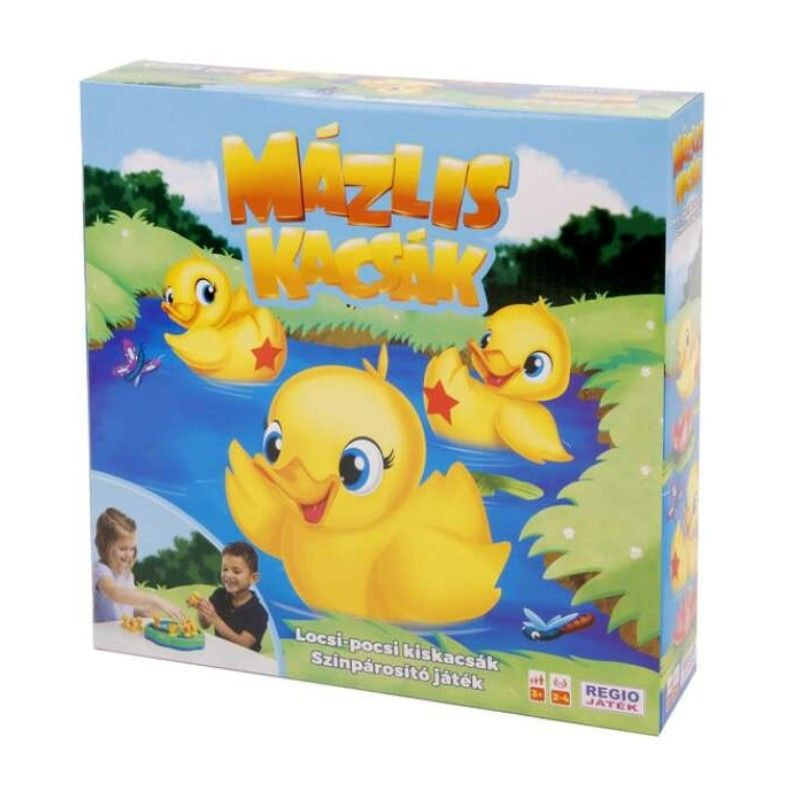Találd meg az összetartozó kacsákat a győzelemért! A Mázlis kacsák társasjátékkal most könnyedén fejlesztheted megfigyelő képességedet és gyorsaságod. Édes kis kacsák úszkálnak a tó tetején, fordítsd fel őket és nézd meg milyen szín és formát rejtenek! Ha a kacsákon található forma megegyezik, szedd ki őket a vízből és gyűjtsd őket egy helyre! A játékot az nyeri, aki először talál 3 összeillő kacsát.A társasjátékban maximum 4 fő vehet részt, így barátaiddal vagy épp családtagjaiddal is megméretetheted magad a nagy kacsavadászatok során. Az édes kis sárga madárkáknak pedig senki nem fog tudni ellenállni, miközben az összeillő formákat keresitek. A készlet tartalmazza a tó alakú pályát, 12 kacsát, egy matrica lapot és a pontos használati utasítást a játékszabállyal együtt. A társasjátékot 3 éves kortól ajánljuk.