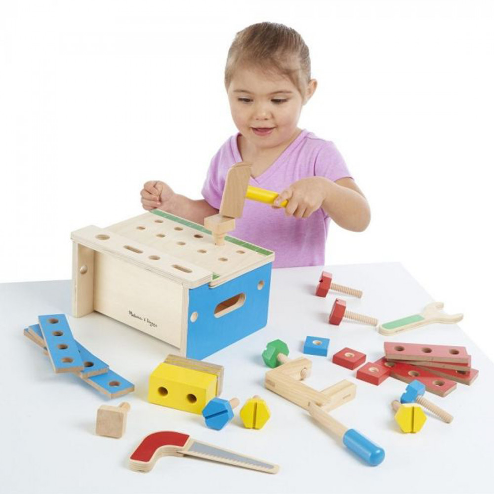 Ez a 32 darabos fa készségfejlesztő barkácskészlet tartalmaz szöget, amit be lehet verni kalapáccsal, csavart, amit be lehet tekerni csavarhúzóval és összeilleszthető illetve szétfűrészelhető panellapokat. És a legjobb az egészben, hogy a készletet szépen, rendezetten tudod tárolni egy fából készült munkalapon, amin még mérce és satu is van. A kis barkácsmesterek a leírást követve elkészíthetnek egy állatot, házat, robotot, hajót vagy bármely általuk megálmodott szerkezetet!Részletek:- 26 építőelemet és 5 eszközt, valamint egy szerszámpadot tartalmaz- tartós fából készült szerkezet- támogatja a finom motoros-, szem-kéz koordinációs készséget, és fejleszti a képzelőerőt- “Elfűrészelhetőek” az öntapadós tépőzárral ellátott fadarabokFedezd fel a játék számtalan formáját! – további játéklehetőségek:a, Kérd meg gyermekedet, hogy rendezze a darabokat szín, forma, méret szerint csoportokba. Nevezd meg az egyes színeket, formákat, méretet, ahogy haladtok egyik csoportról a másikra, közben rámutatva az egyes darabokra. Majd számoljátok meg és hasonlítsátok össze a csoportokban lévő elemeket. Melyik csoportban van a legtöbb elem? Melyikben van a legkevesebb?b, Illessz össze pár darabot (pl.: egy csavart, egy panelt és egy anyacsavart) majd kérd meg gyermekedet, hogy másolja le a szerkezetet.c, Építs két, egymáshoz hasonló, azonban apró részletekben eltérő szerkezetet. Kérd meg gyermekedet, hogy mutasson rá az eltérésekre, majd az egyiken javítsa ki az eltéréseket úgy, hogy teljesen egyezzen a másik szerkezettel.d, Építs egy viszonylag bonyolult szerkezetet, majd kérd meg gyermekedet, hogy amilyen gyorsan csak lehet, szedje szét azt a csavarhúzó és a csavarkulcs segítségével. Mérheted is az idejét órával, vagy akár hangosan számolva. Majd állíts újabb kihívást gyermeked elé, és vedd rá, hogy megdöntse rekordját.e, Kérd meg gyermekedet, hogy illesszen a szerszámpadra annyi darabot, amennyit csak tud. Nehezítésként, köss ki különböző szabályokat, mint például “Nem lehet sárga színű darab a munkalapon” vagy “Ez az oldal legyen magasabb, mint a másik oldal”.f, Bíztasd gyermekedet arra, hogy készítsen egyedi tervezésű autót, épületet vagy egy teremtményt. Adj neki utasításokat, mint például “Építs egy robotot” vagy egy kreatív kihívást állíts elé “Építs valamit, ami át tud menni egy köves patakon anélkül, hogy elsüllyedne”, hogy képzelőerejét mozgásban tartsd.