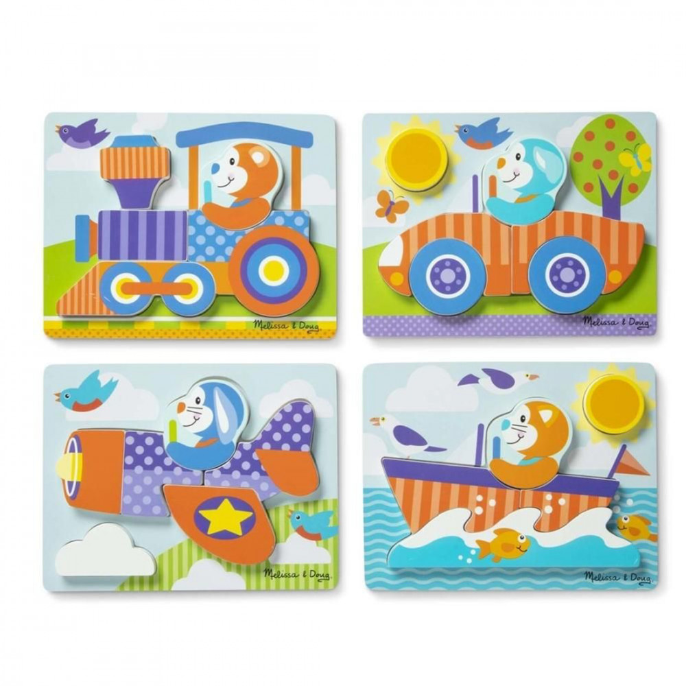 Az apró kezecskék és a hatalmas fantázia imádni fogják ezt a négy szórakoztató járműkirakós összeállítást. Párosítsd össze a tartós, könnyen megfogható fából készült darabokat a négy puzzle táblán lévő képpel, és fedezd fel rajtuk a négy járművet, melynek vezetőit cserélgetheted is: öt elemből álló vonat, és hajó illetve hatelemes repülőgép és autó kirakós. A puzzle darabok és a kirakós tábla élei le vannak gömbölyítve, finoman vannak megmunkálva, így kiválóan alkalmasak a legkisebbek számárára is egy kacagtató játékra. A játék alkalmas születésnapi ajándéknak is! Ez az „első kirakósom” játék ösztönzi a finommotoros és a problémamegoldó készséget és kiválóan alkalmas minták és színek felfedezésére. Az „Első játékom” élénk színekkel, határozott mintákkal és bohókás dizájnnal rendelkezik, mely fejleszti a gyermek képességeit, miközben élénkíti a képzelőerőt – már a kezdetektől fogva!Részletek:- öt- és hat darabos, nagy elemekből álló kirakós játékok, jármű témákkal és cserélhető vezetőkkel- könnyen megfogható, sima felületű, fából készült darabok és kirakós tábla, kerekített sarkokkal, kiváló minőségű anyagból- párosítsd az elemeket a fából készült táblán lévő képekhez- segíti és ösztönzi a finommotoros és a problémamegoldó készség fejlődését. Kiválóan alkalmas minták és színek felfedezéséreFedezd fel a játék számtalan formáját:- FINOMMOTOROS: kérd meg a gyermeket, hogy építsen tornyot a kirakós elemeiből – majd döntsétek azt le!- PROBLÉMAMEGOLDÁS: helyezzétek a táblára az összes elemet 1 kivételével. Kérd meg a gyermeket, hogy ezt Ő tegye a helyére- SZÍNEK: mondd ki a színek nevét, amelyekre rámutatsz a kirakós táblán- SZÁMOK: számolj hangosan, amint az egyes darabokra mutatsz és amint a gyermek azt a táblára helyezi